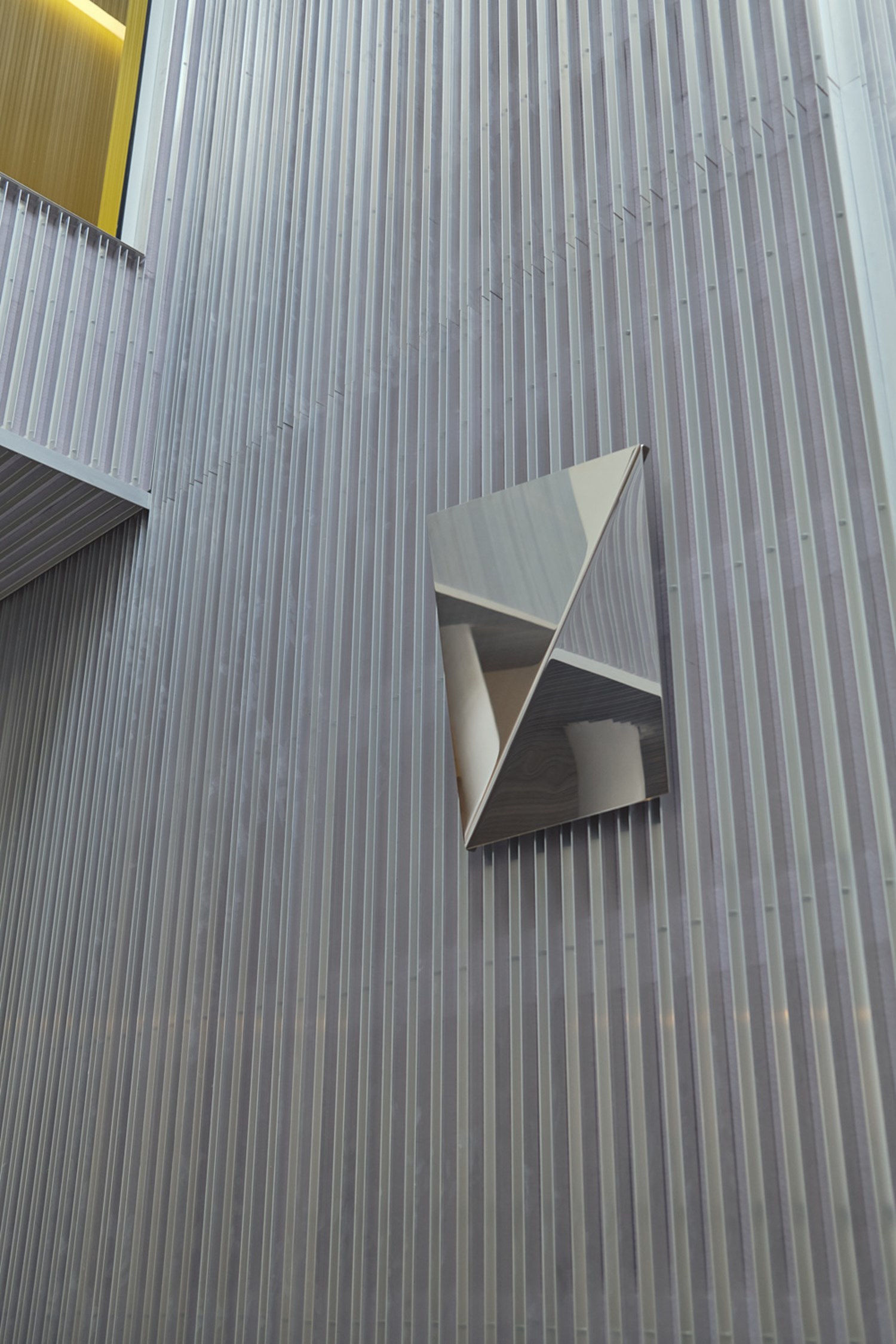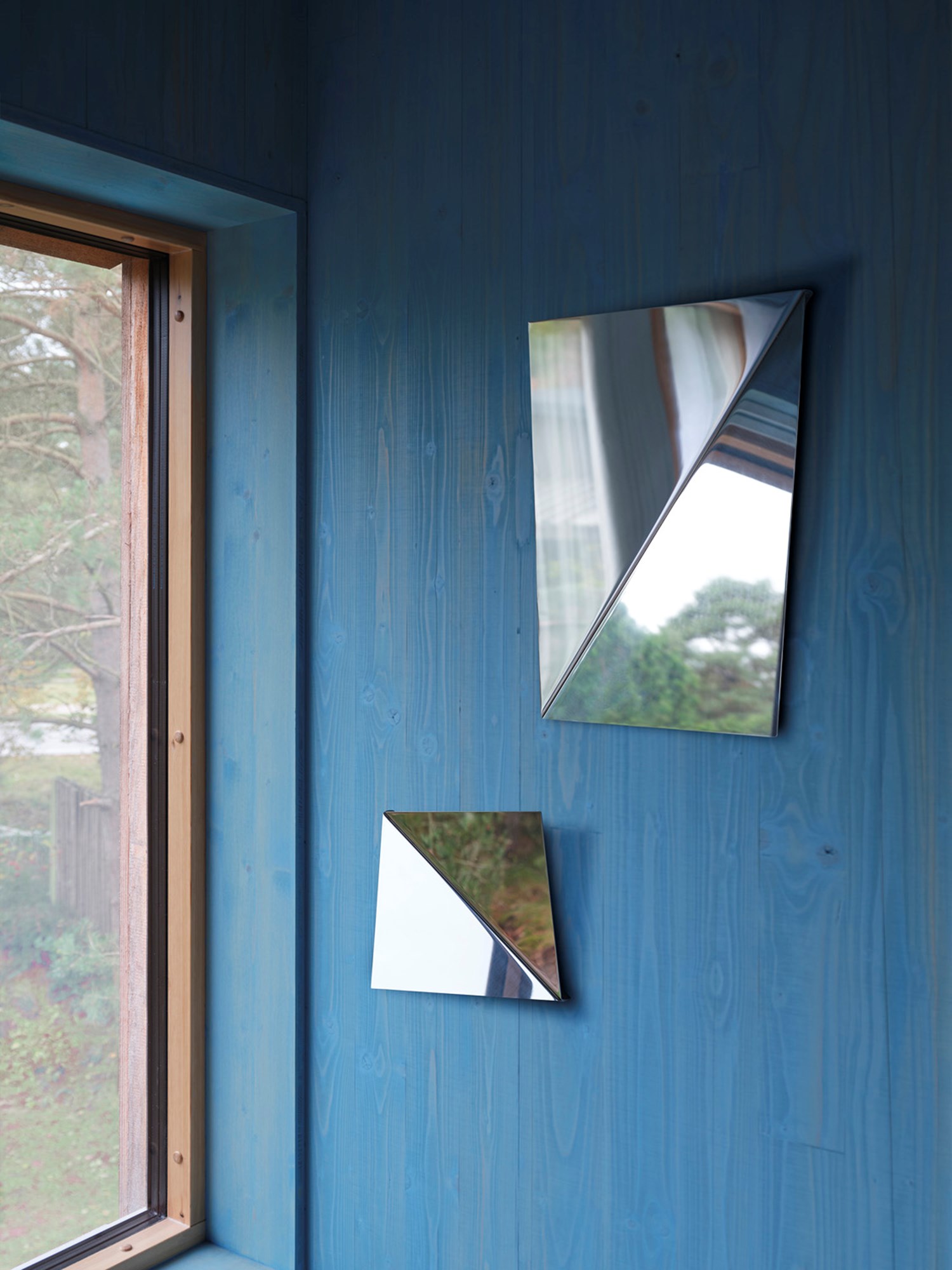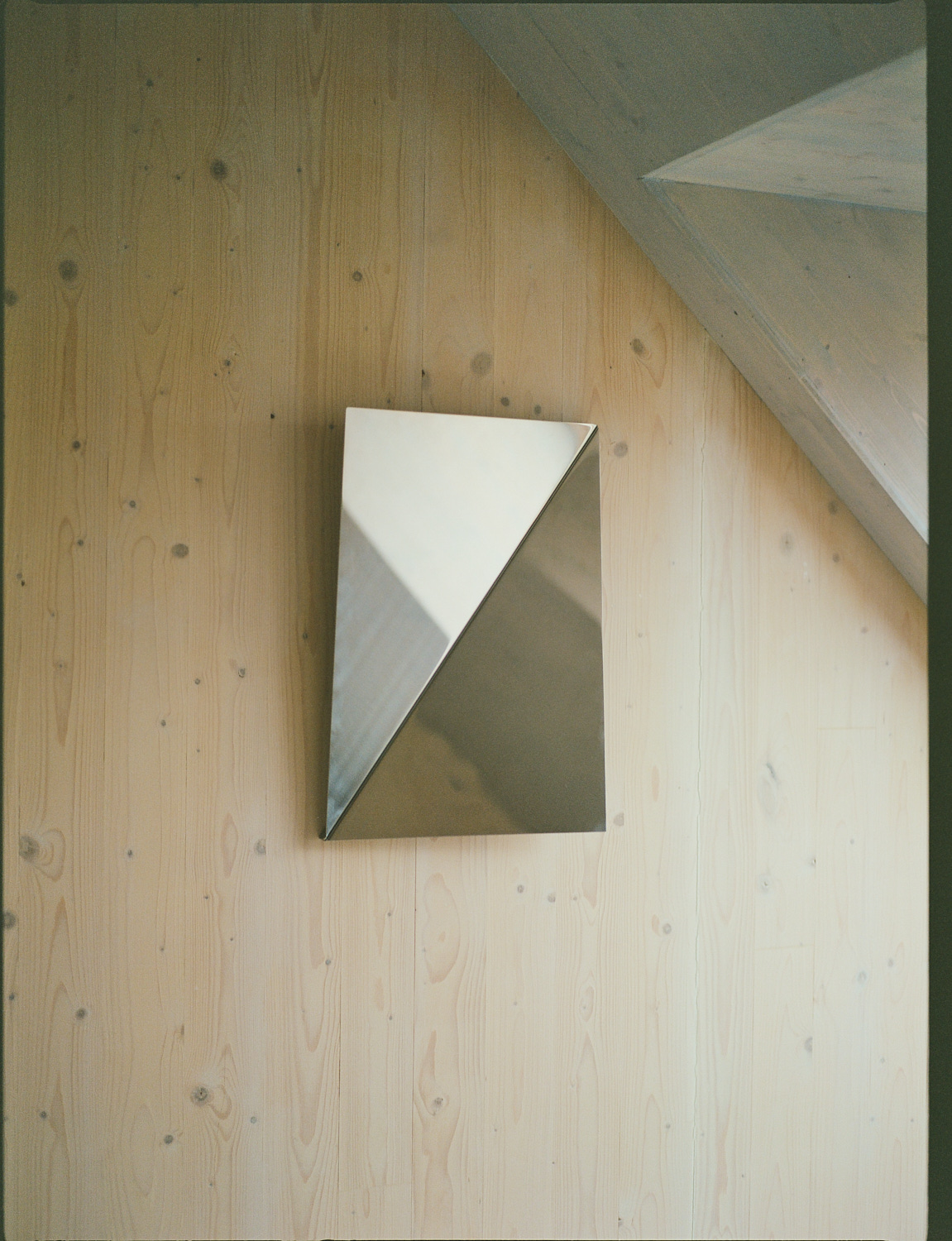 This wall-mounted image mirror offers a new perspective through its carefully angled surfaces, which create beautiful refractions and balance functionality and artistry.