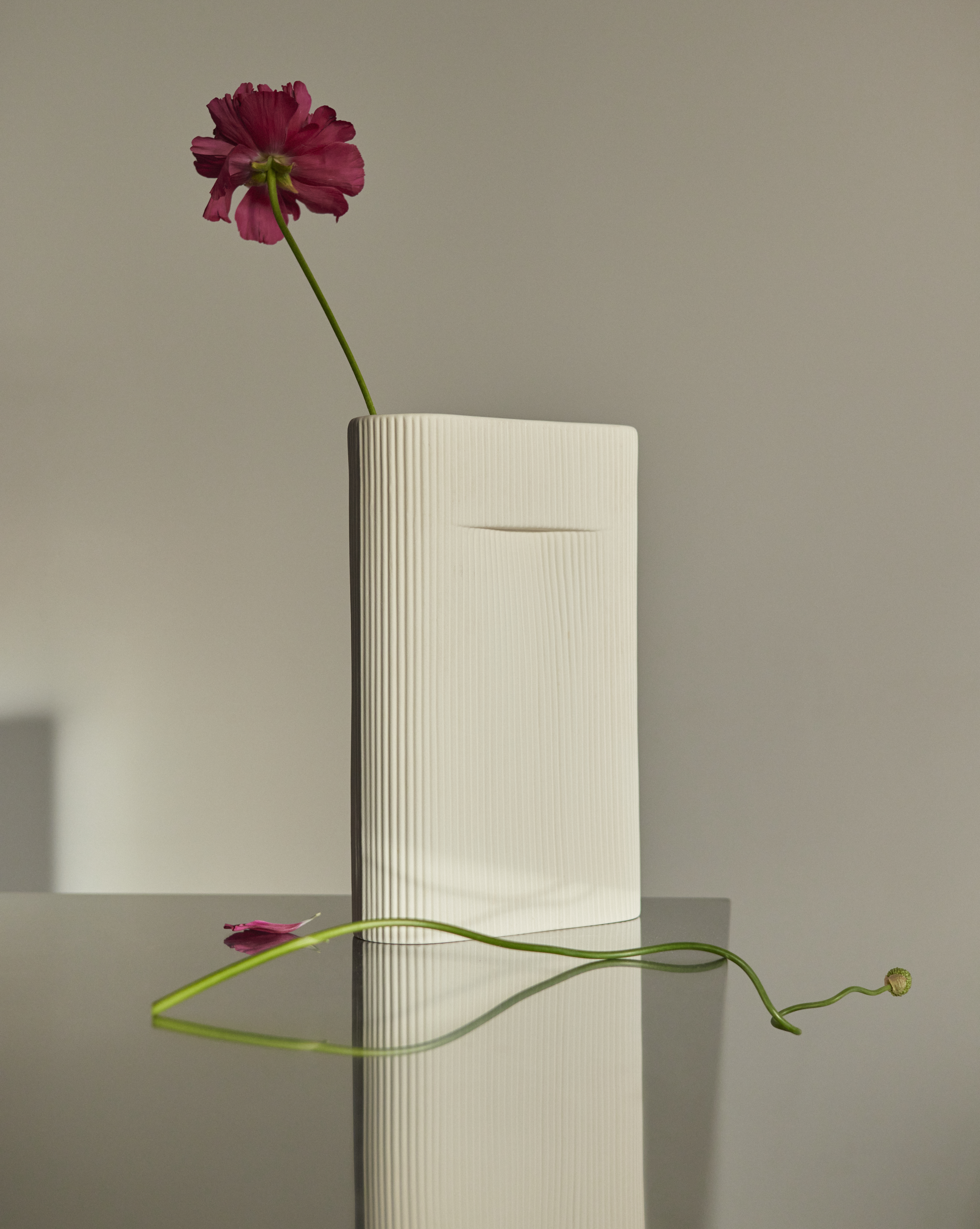 On working with the shapes of Muuto's Kink and Ridge Vase, Marvin notes: "Both designs have an interesting, distinct shape. To me, the perfect vase is not just a vessel, but more of a dialogue between vase and flowers — both have something to contribute with"