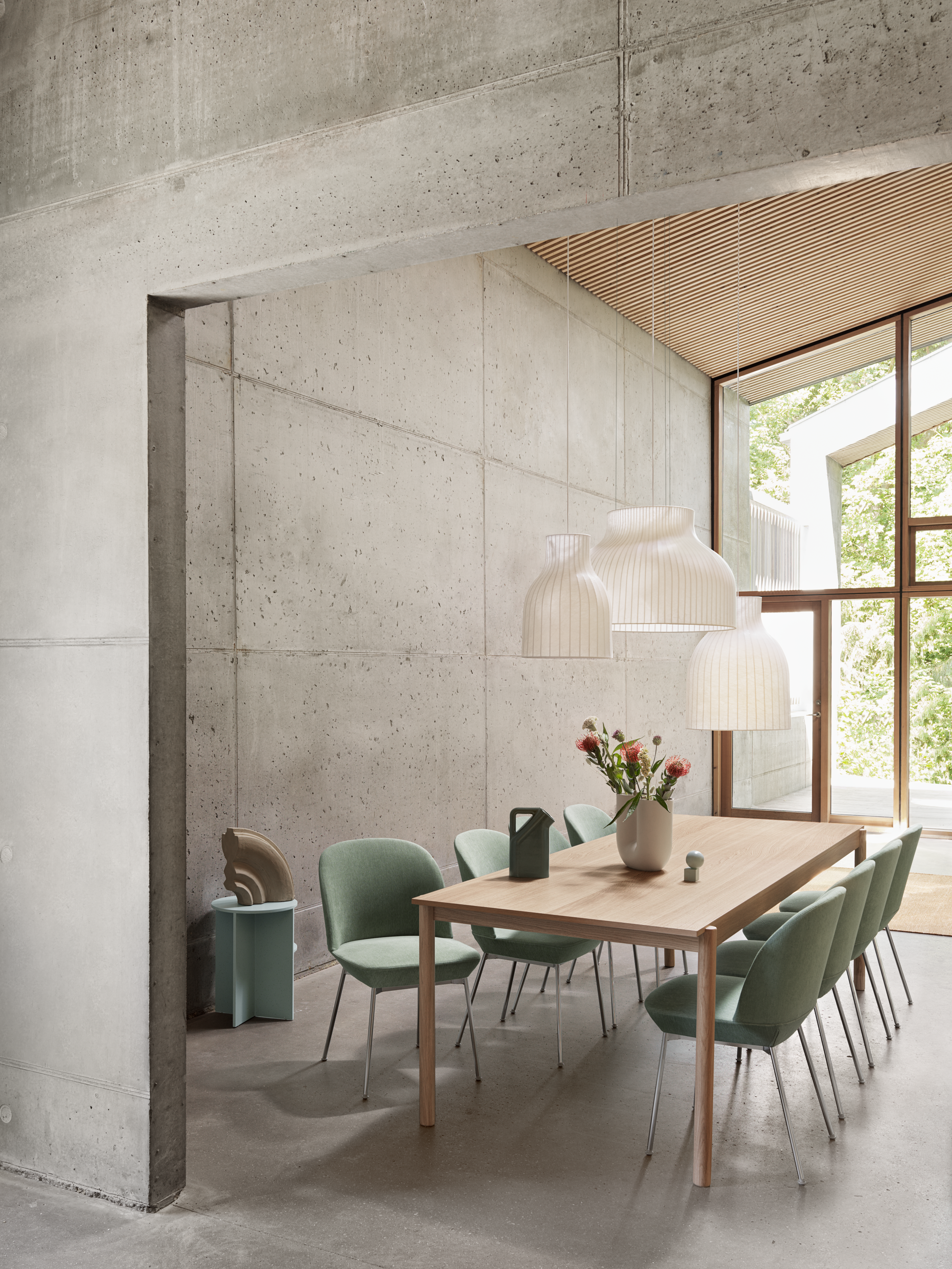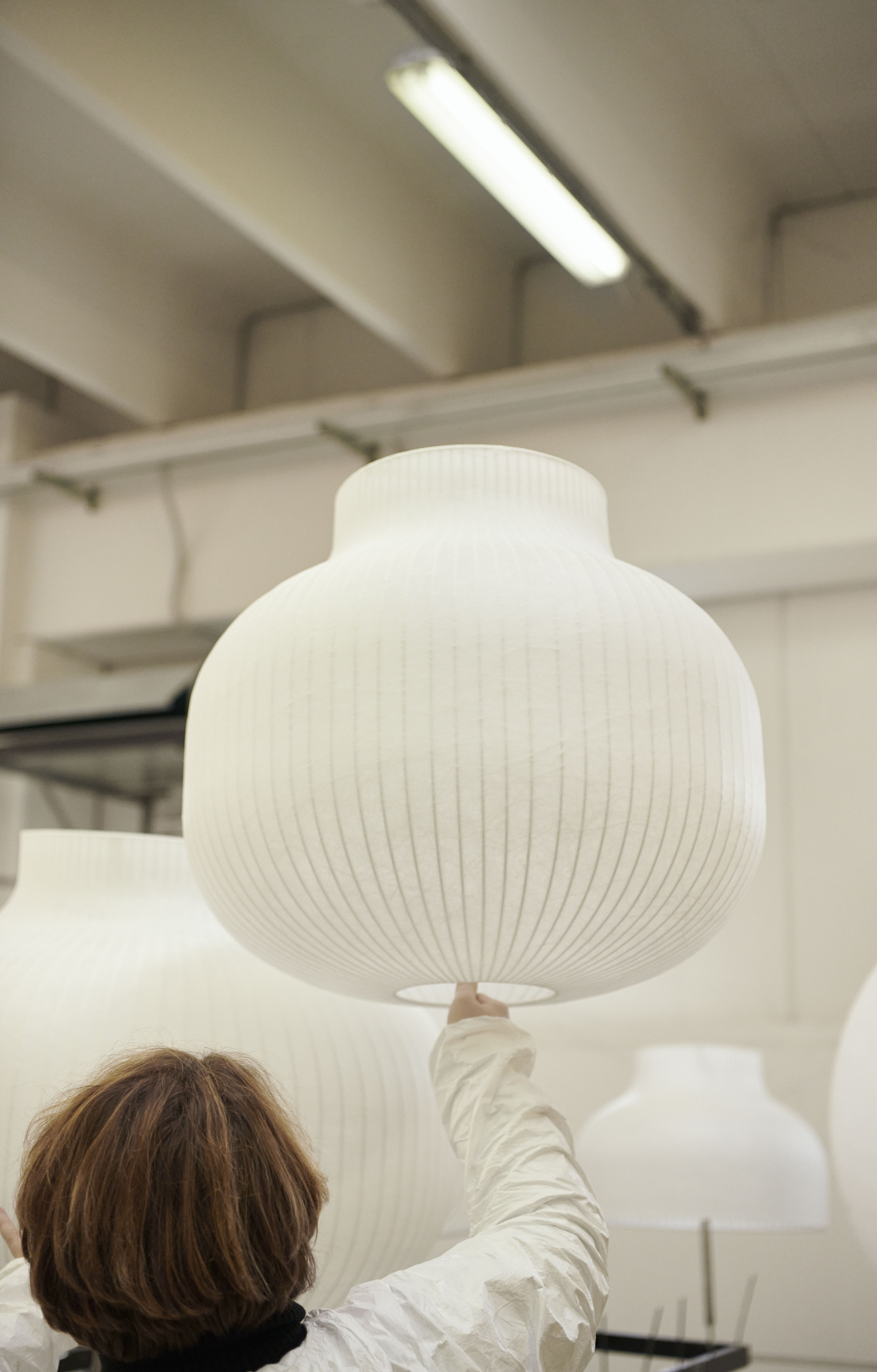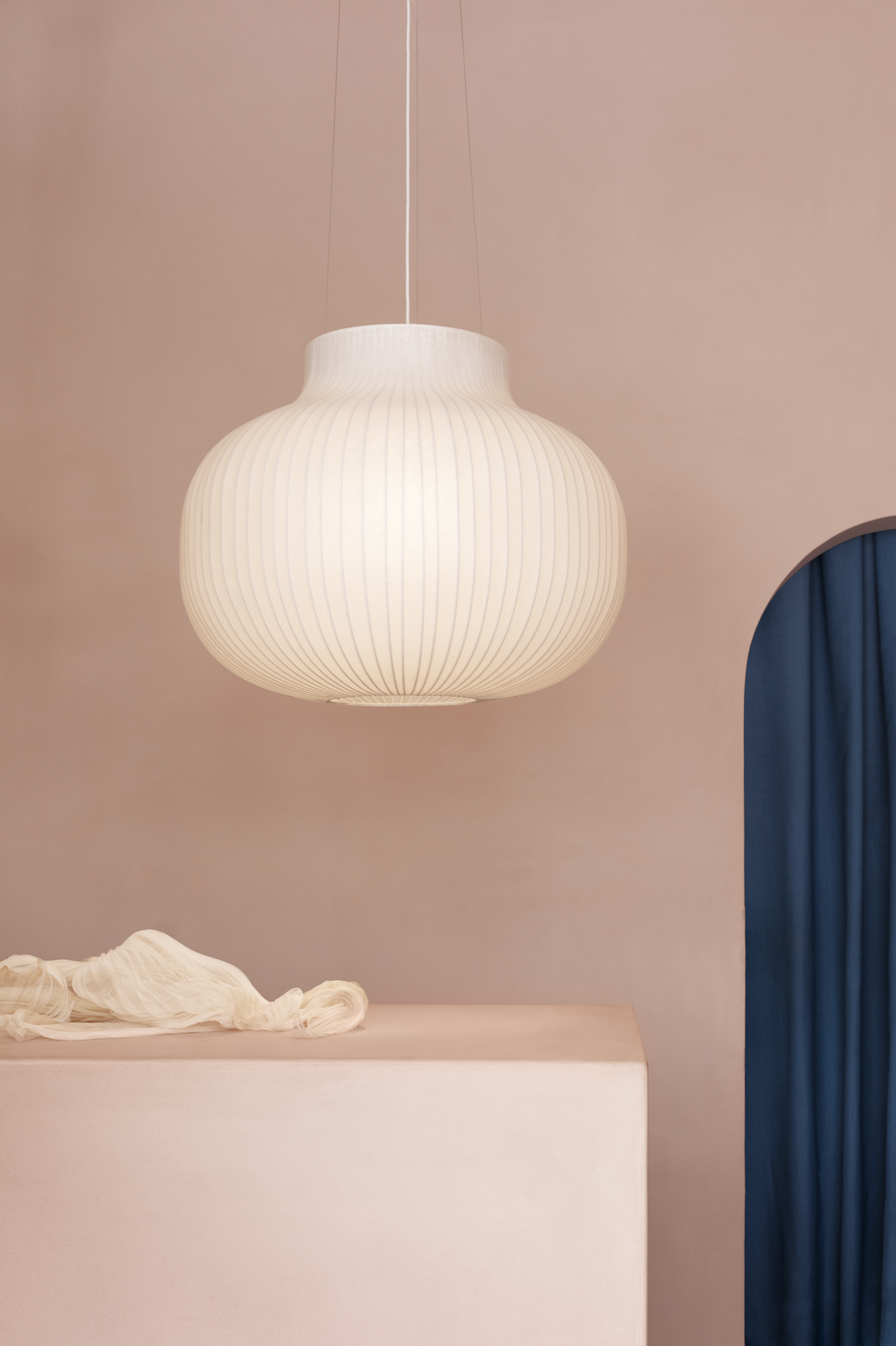 The Cocoon material gently filters the light, giving the room a warm, comfortable glow. The soft rotation symmetry and soft external expression of the Strand Pendant series is a direct result of the material’s properties and application. It gives a sense of spatial lightness—as if hovering mid-air—bringing a distinct warmth and ease to any setting.