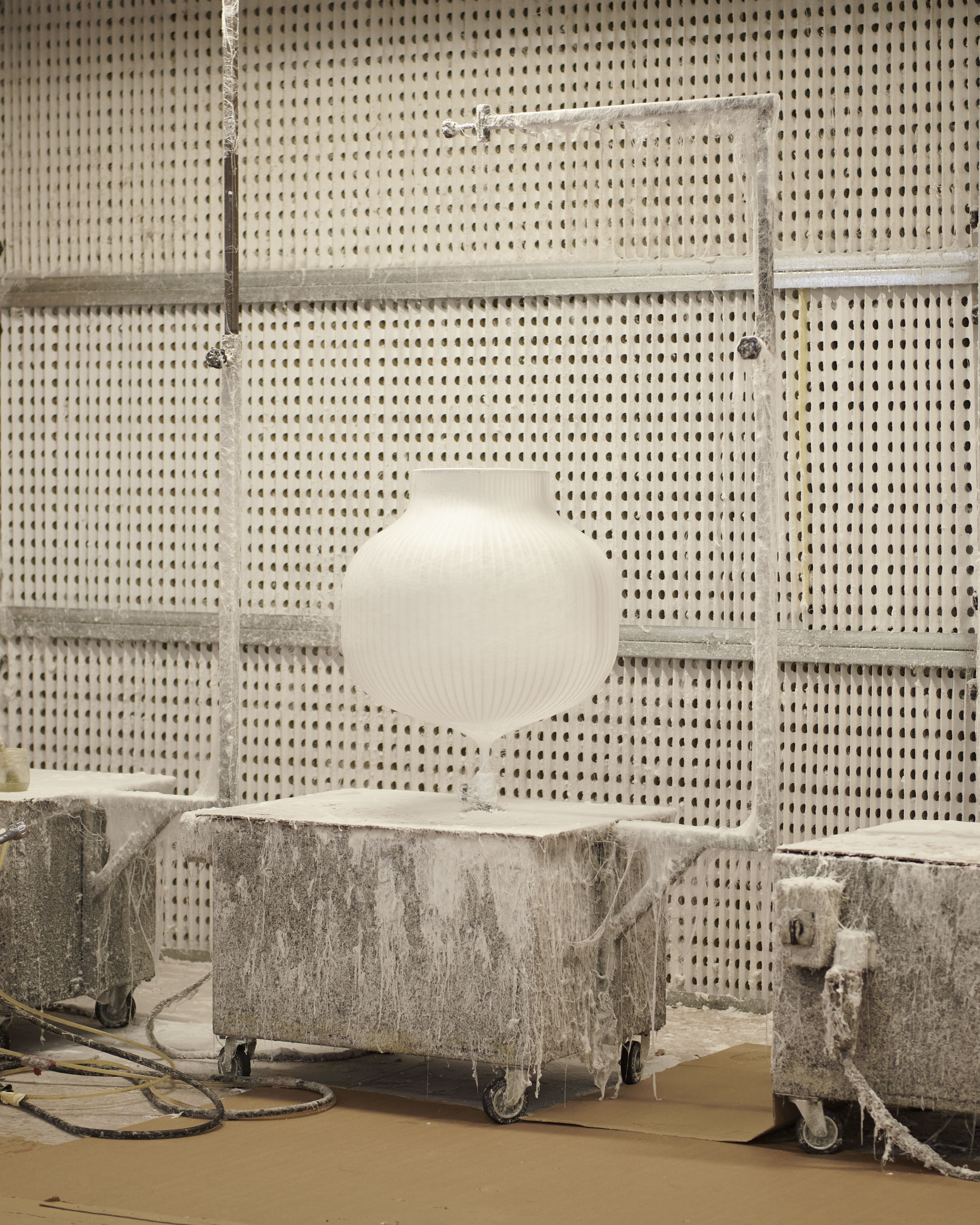 "The Strand Pendant Lamp is formed from a sprayed cocoon material with its cloud-like appearance that tightly clings to a spinning steel frame. It consists of tiny strands for a complex, intriguing structure that shrouds the light source while acting as its diffuser."