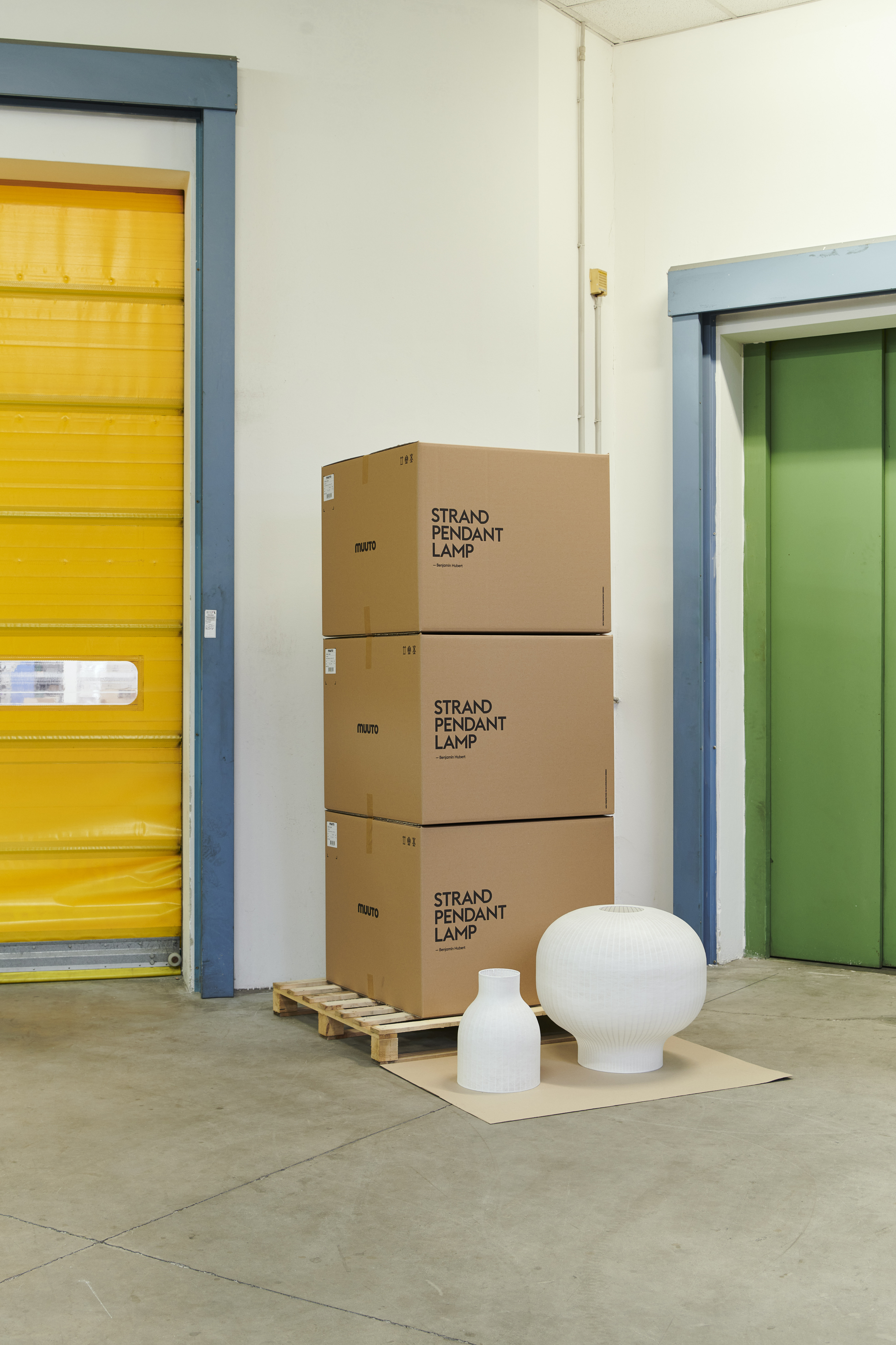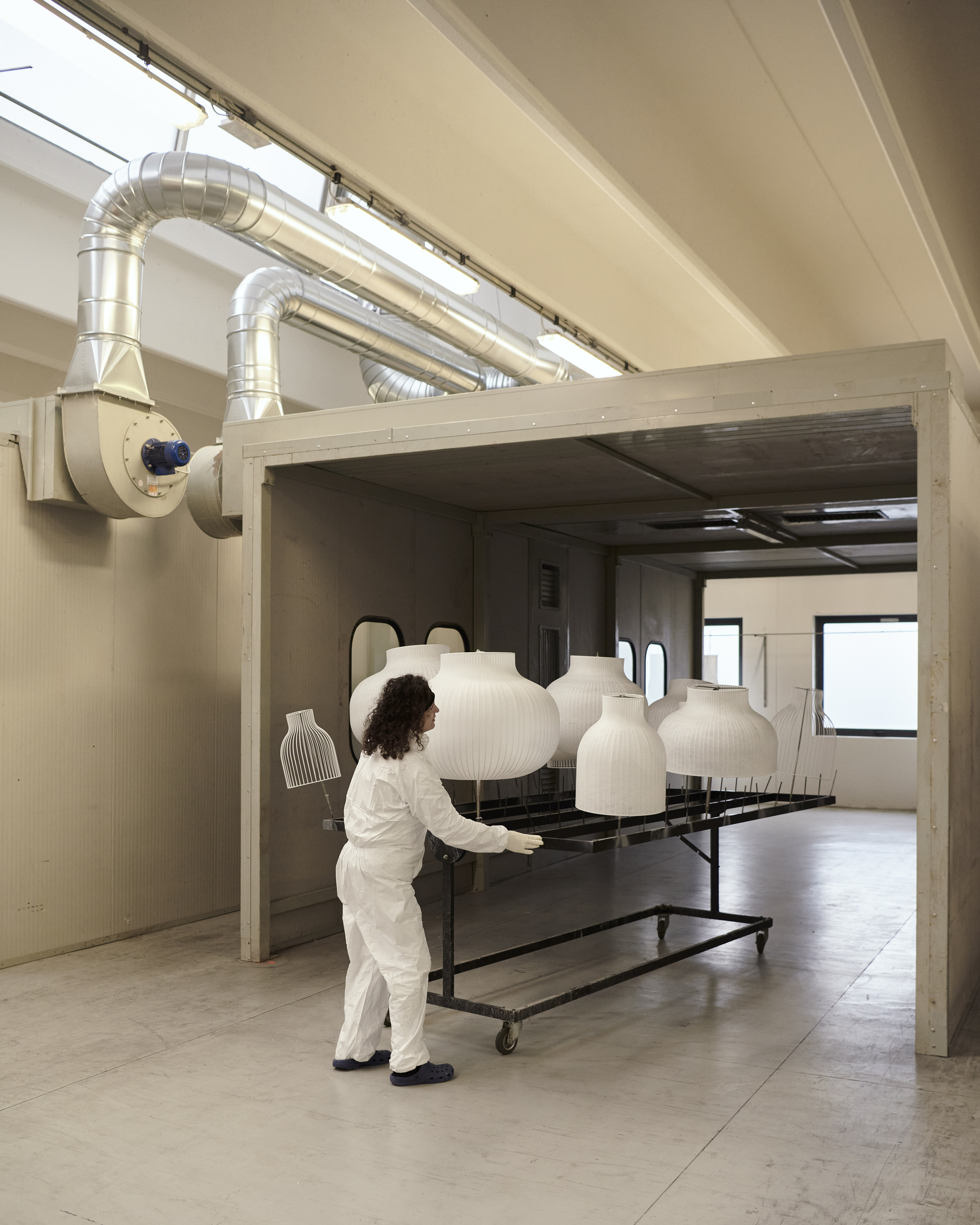 The Strand Pendant Lamp is made by spraying a steel-structure with a Cocoon material originally developed as a sort of weather-resistant skin protecting metal products and surfaces from corrosion and the elements when shipped by sea. The unique spray-on method makes it easy to use on small as well as monumental objects, such as turbines and cargo ships.