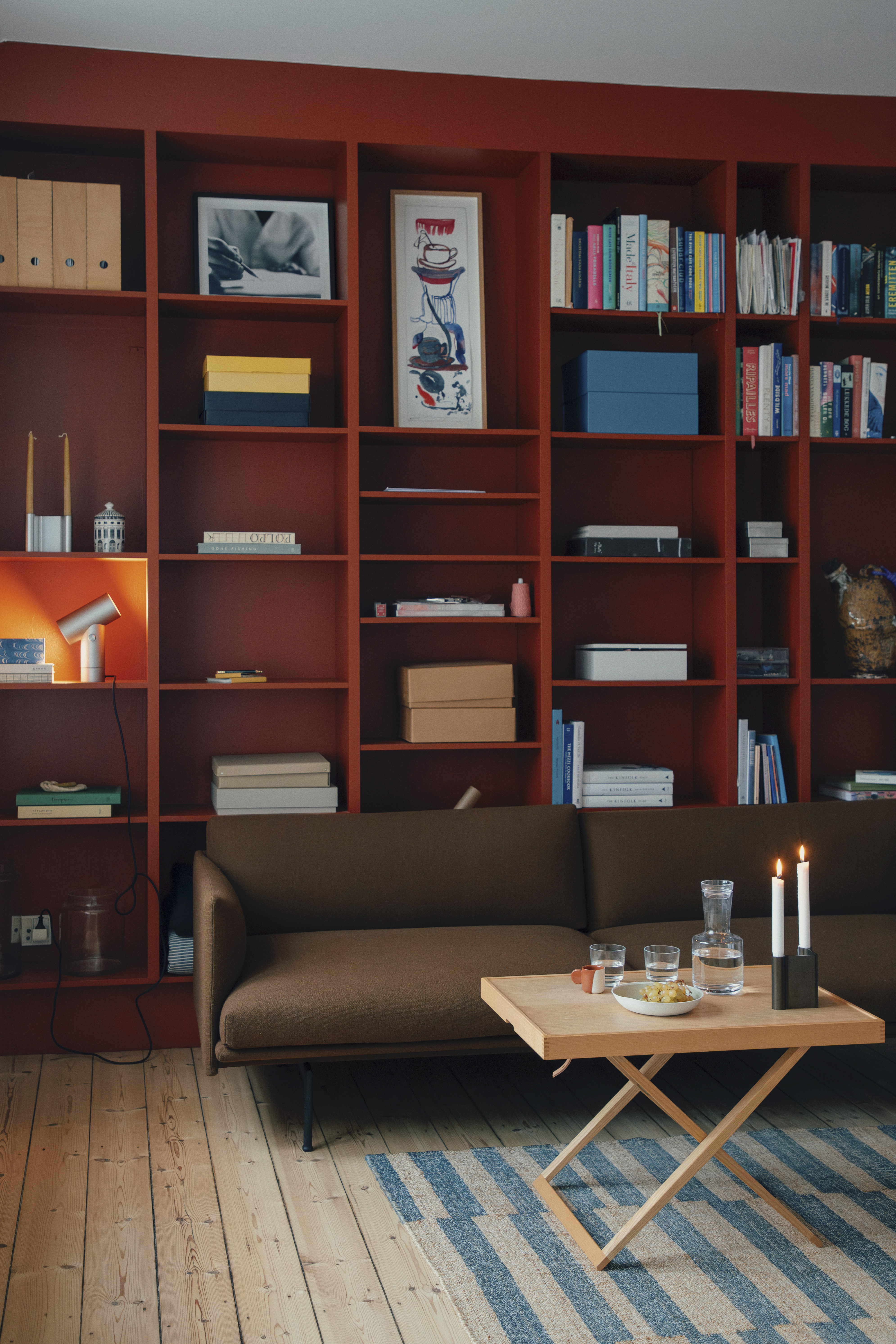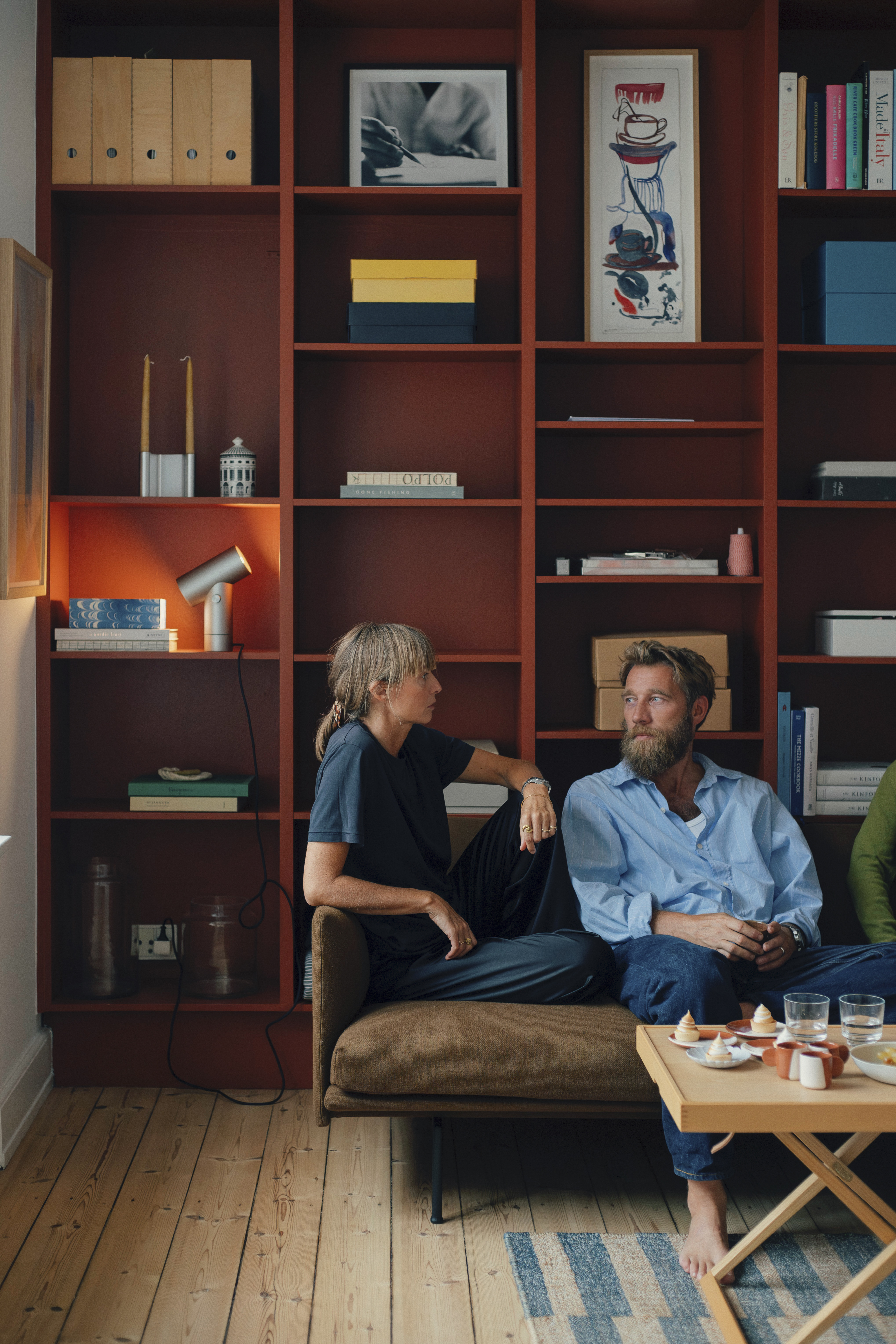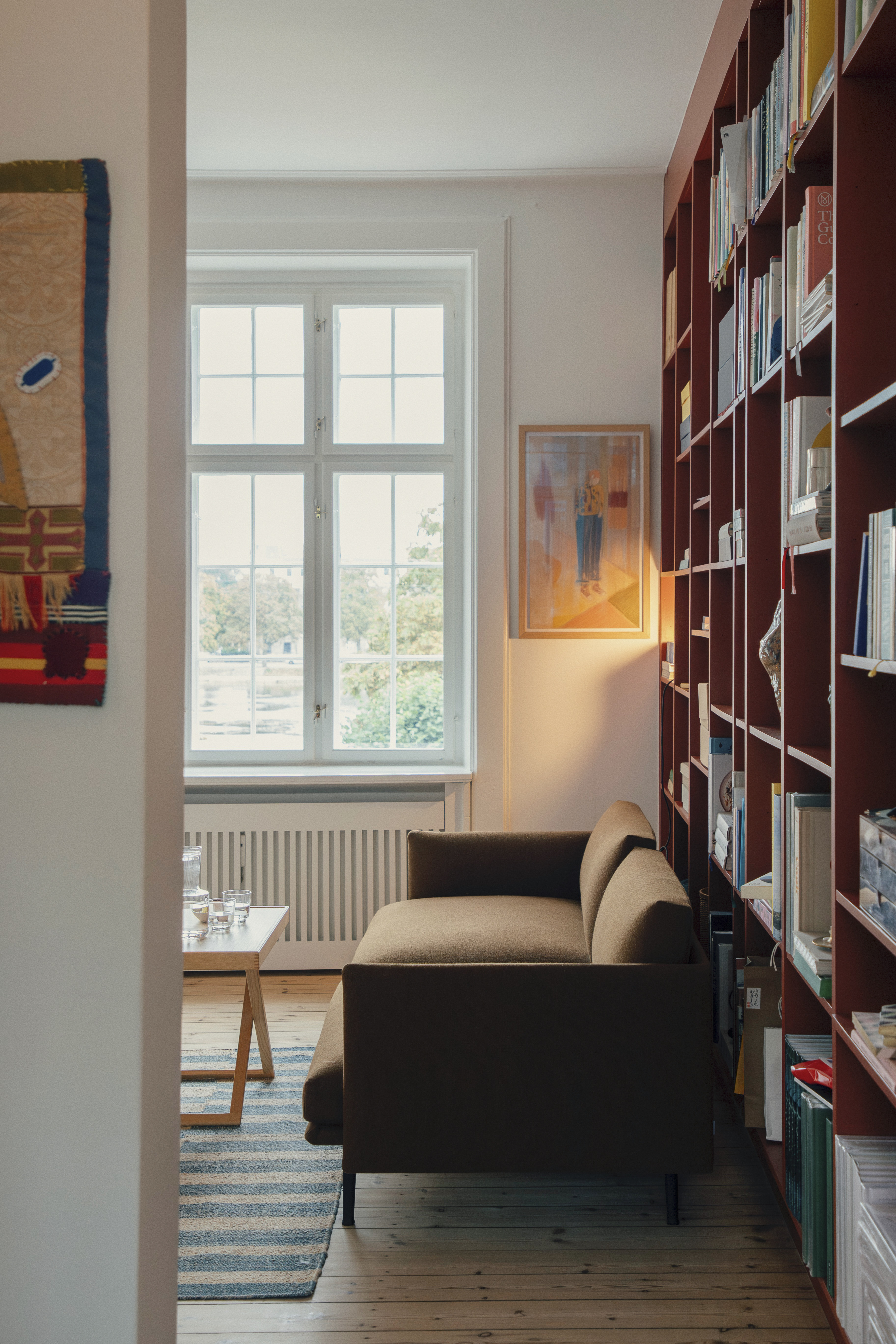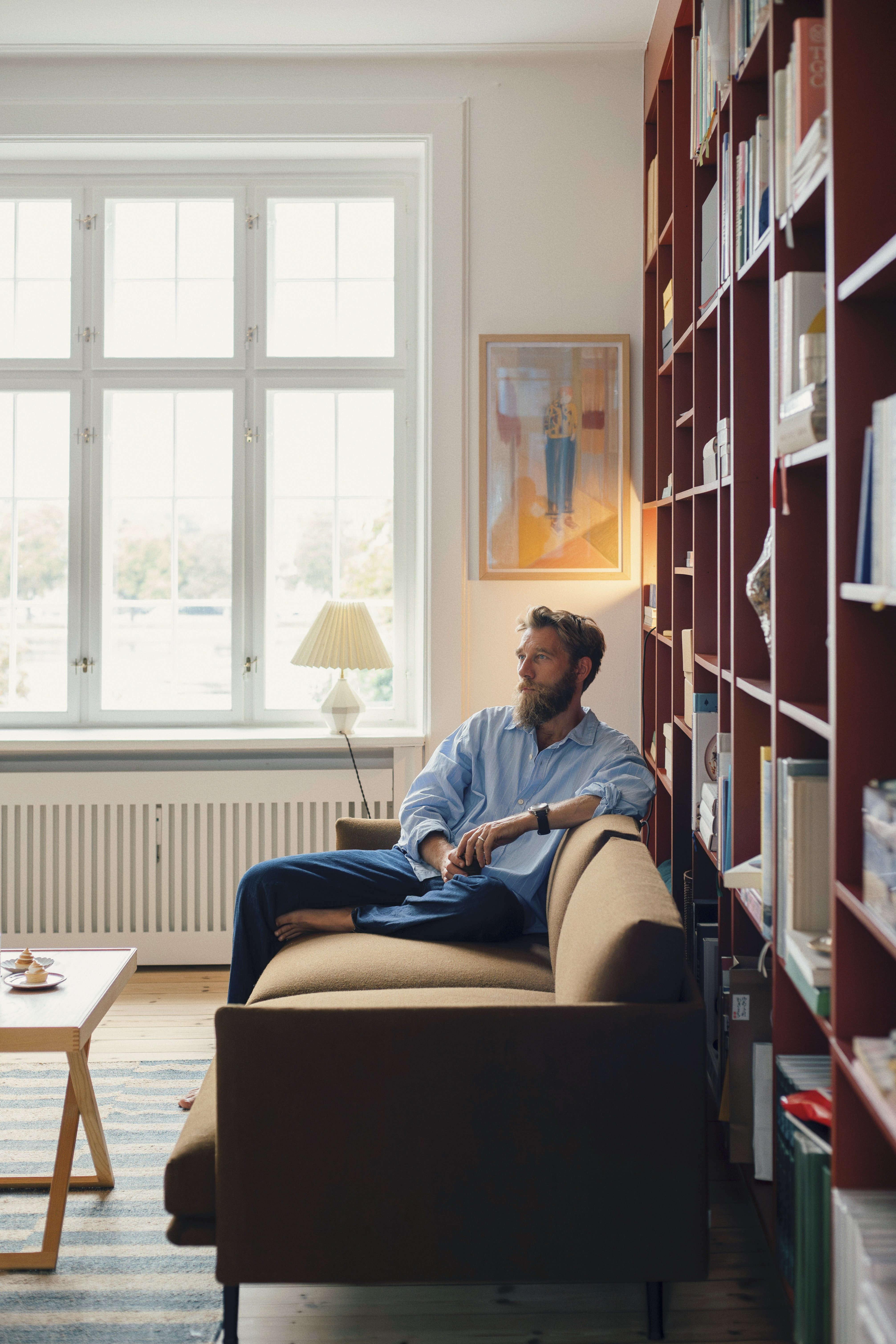 Mikkel: We have a lot of art and color in the home, so we try to balance that with furniture that feels timeless and grounded. This sofa does that—it’s big enough for us to really use it, but simple in its shape and proportions. The color also works perfectly with the bookshelf behind it, which we actually painted red not long ago. That small change made a big difference.