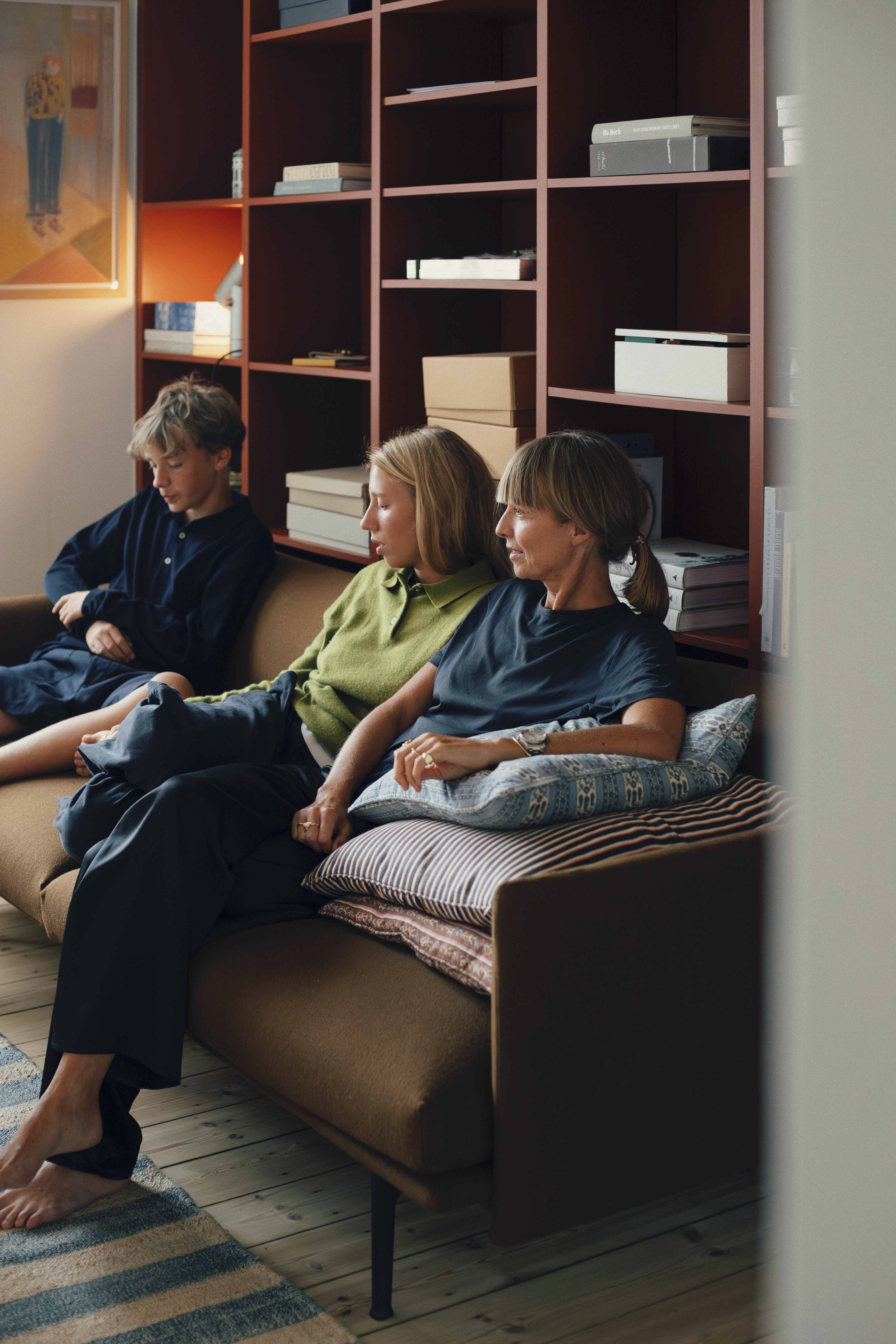 Camilla: We loved how simple the design was. It’s clean and calm, and the Hallingdal fabric is durable—important when you have a big family. The warm brown shade, number 350, fits beautifully with the red bookshelf and our wooden floors. It brings a sense of calm and ties the room together without taking over. We don’t have one strict style—it’s more a mix of classic furniture, colors we love, and pieces that feel personal. The sofa is part of that balance.