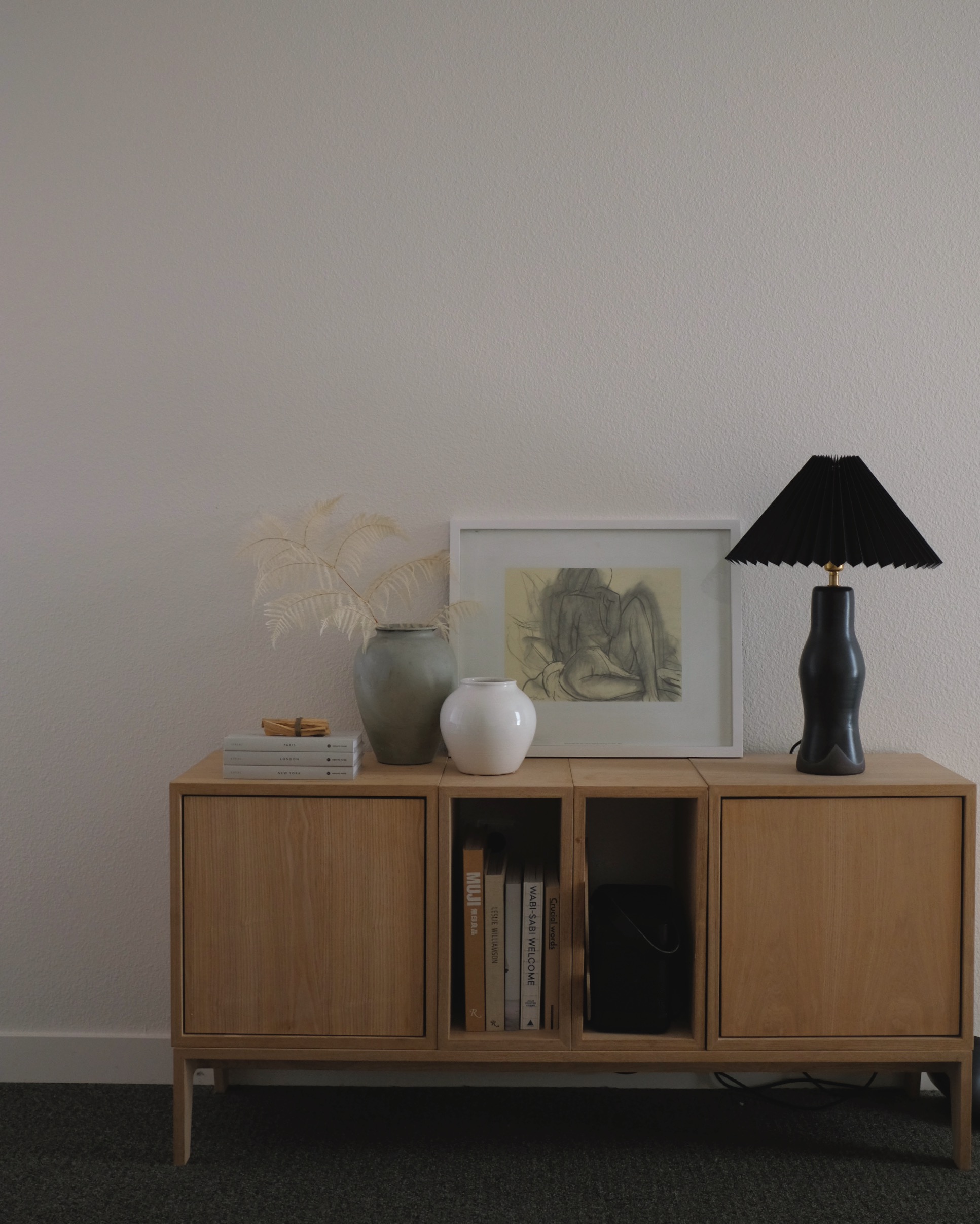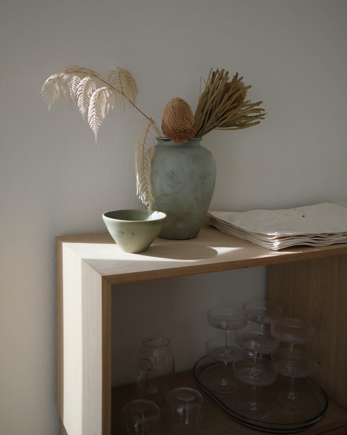 Arranging and rearranging is an essential part of her process, at work and at home, where she experiments with composition, form, material and texture, incorporating objects both old and new. These move in and out of the space – some make their way onwards to her clients, others stay. A constant has been her Stacked Storage System, a trusty companion in her last homes.