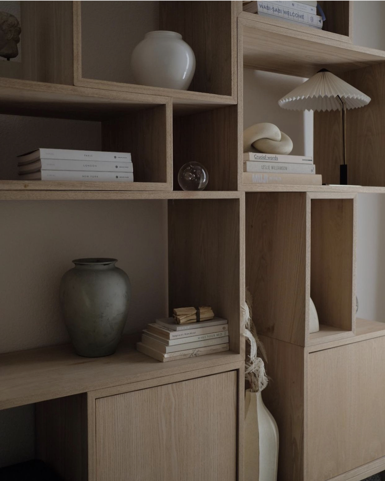 jennifer hagler It can do so much. Functionally it is a sturdy piece that lets you intuitively build according to your own desire. Boxes can be turned on their side – raised for a tall lamp or lying down for a stack of magazines. It is equally attractive when filled to the brim as sparsely arranged with few objects.