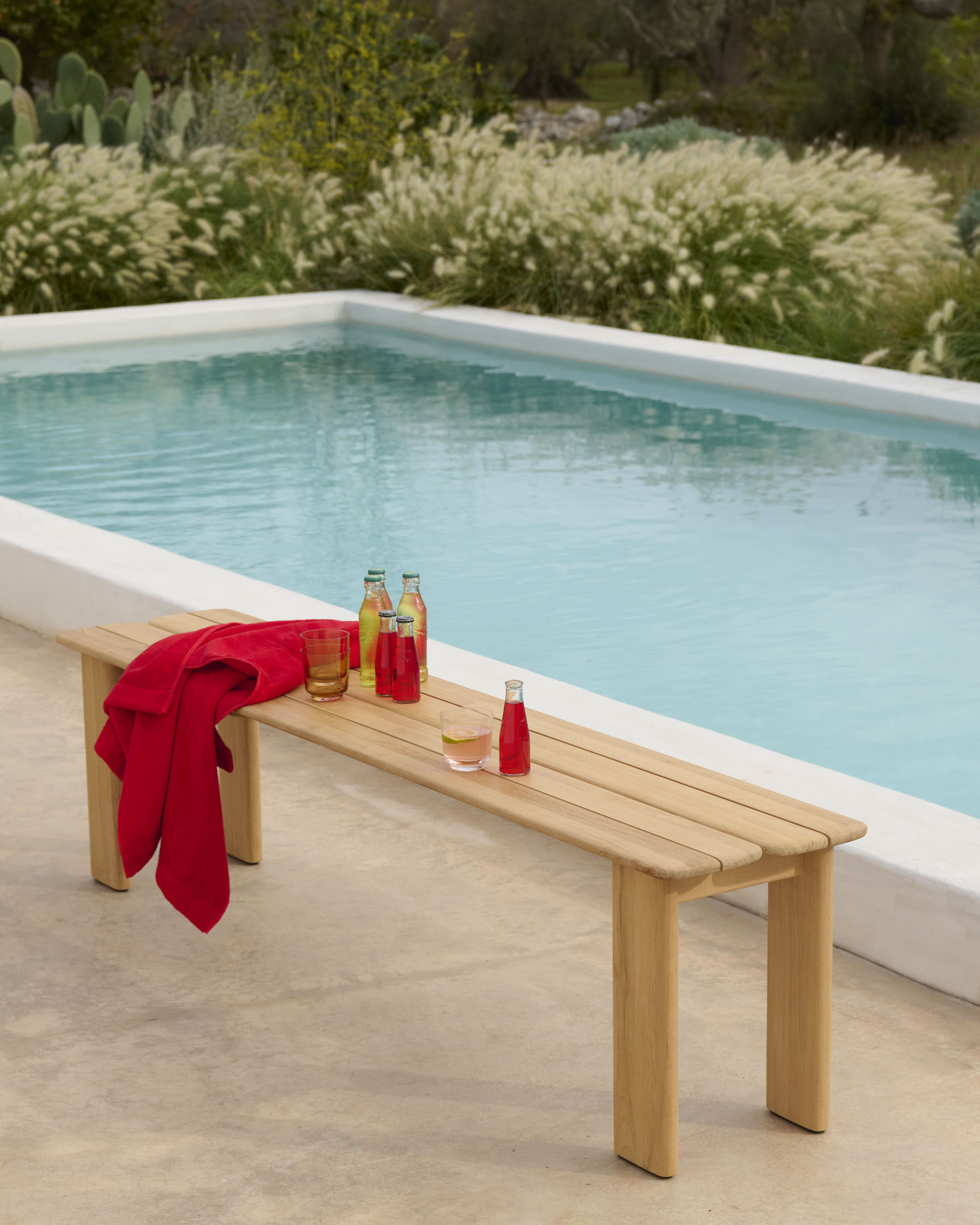 Available in three table sizes and a matching bench, Assemble complements a wide range of outdoor environments — from private terraces to public courtyards. Its sculpted teak and relaxed proportions bring a quiet structure to everyday gatherings. A tailored outdoor cover is also available to set aside during the winter months and help extend its lifespan.