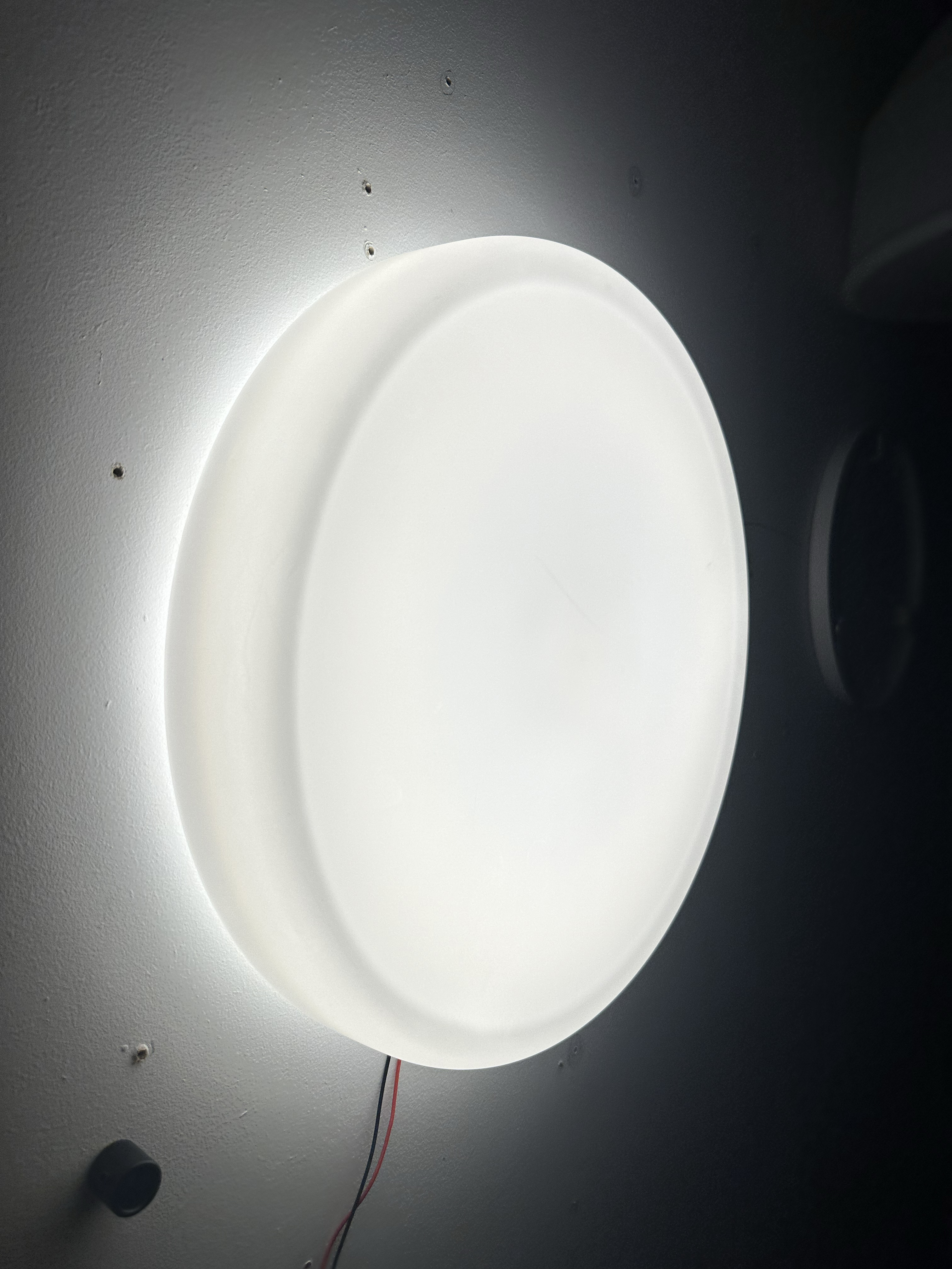 The result is a fully illuminated, dimmable lamp that balances ambient softness with functional clarity. The glass appears thickest at the outer ring, subtly intensifying the glow toward its edge and enhancing the sculptural quality of the piece.