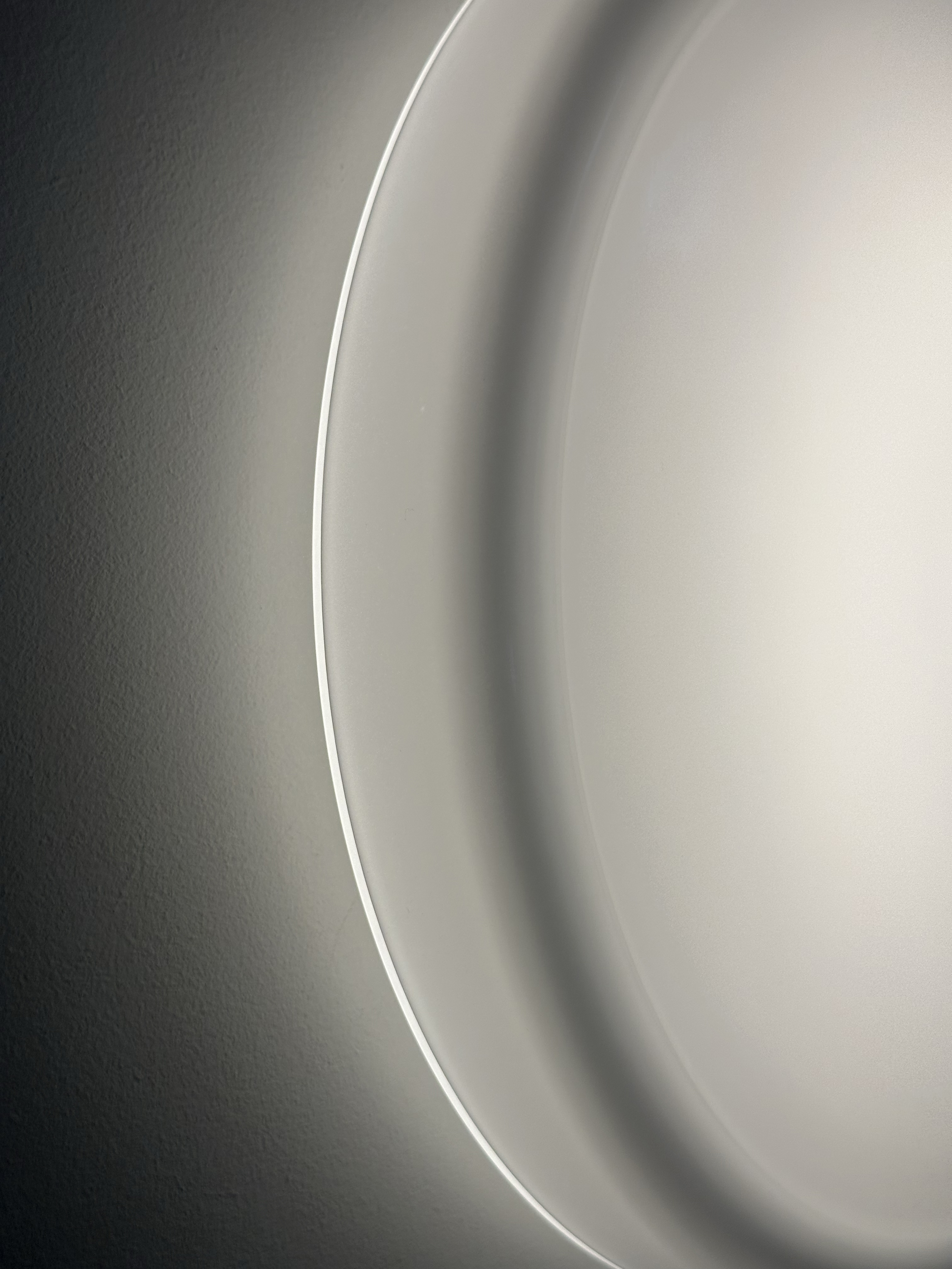 Made from three layers of mouth-blown glass — combining opal and transparent finishes — the lamp creates a subtle 3D effect. As you move around it, the curved edge and coil-like periphery produce soft, shifting halos of light.