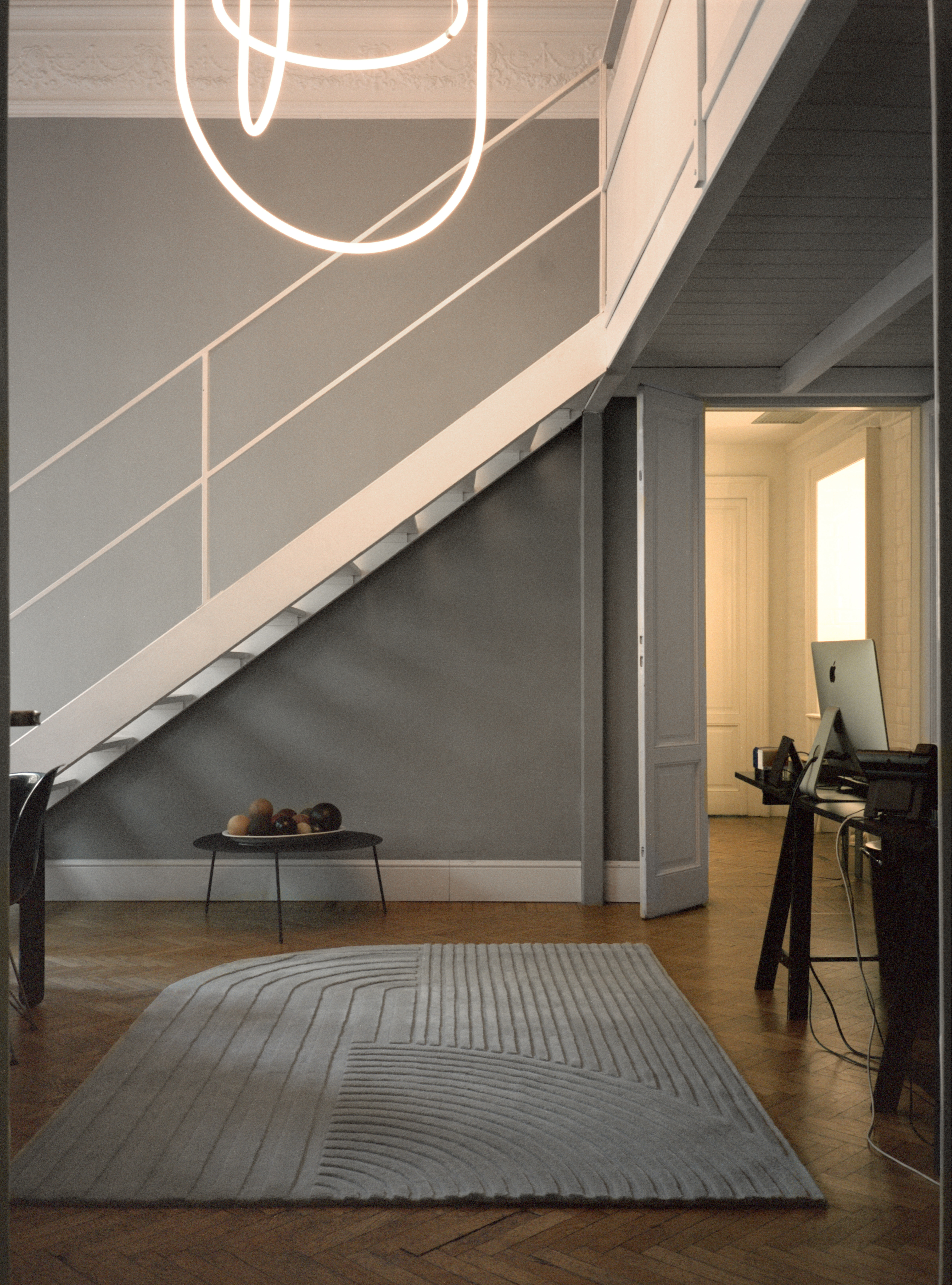 Bringing their rich material know-how and sensitivity for craftsmanship to the task, they make Relevo Rug a further exploration of tufting — it is their interpretation of what they dub a sort of ‘limitless’ technique. Choosing a matte quality made with 100% New Zealand wool, it is an example of how material supports design, making its pattern and shadowplay more pronounced.