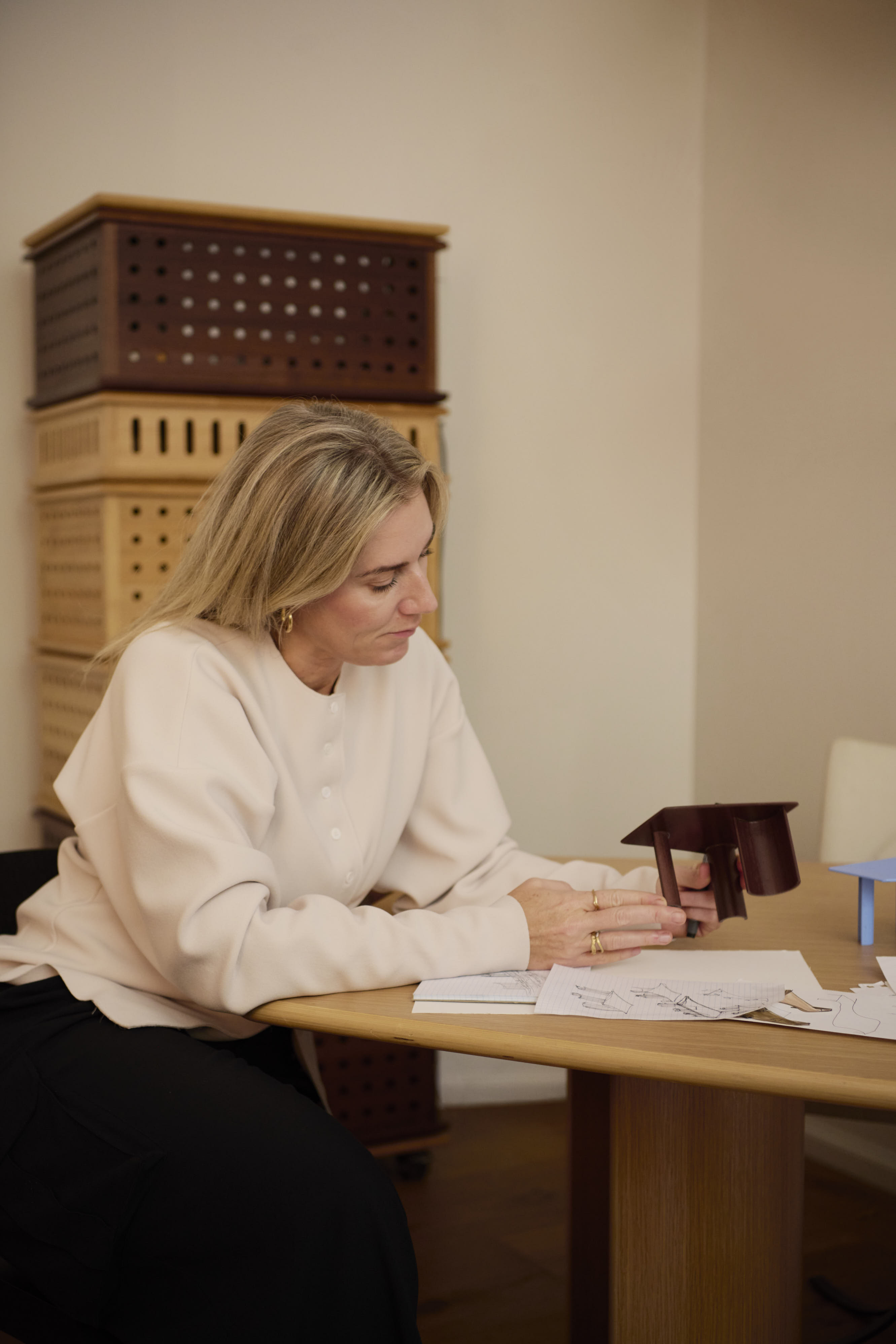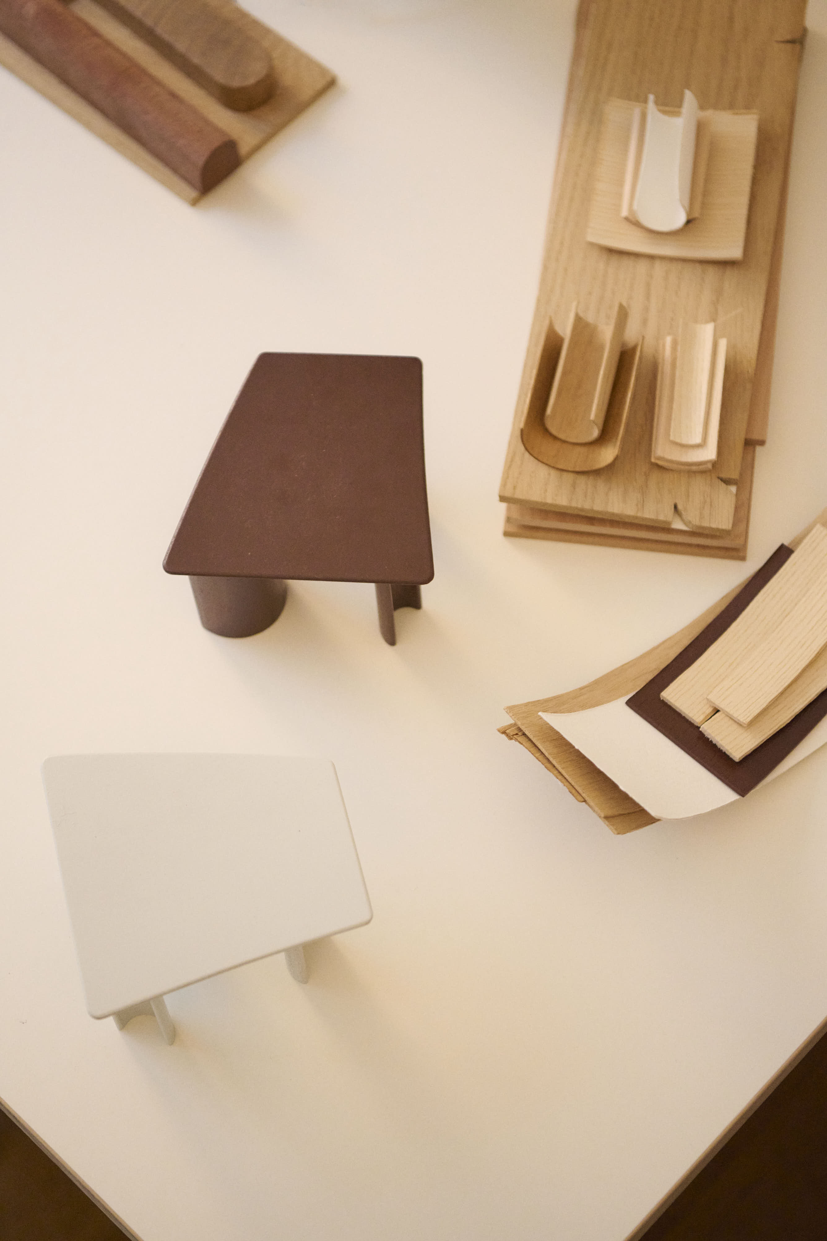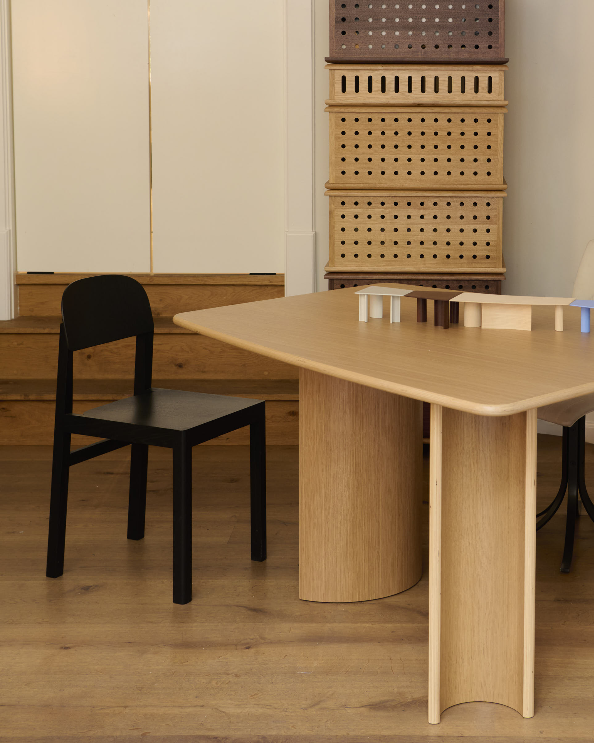 We visited Maria Bruun in her studio in Østerbro, Copenhagen, a bright, open space where large windows draw in daylight and illuminate prototypes, material samples, and working sketches. At the center stands Re-Norm in oak. Its sides are slightly uneven, and as you move around it, the geometry shifts. From above, the form resolves into a sail-like silhouette.