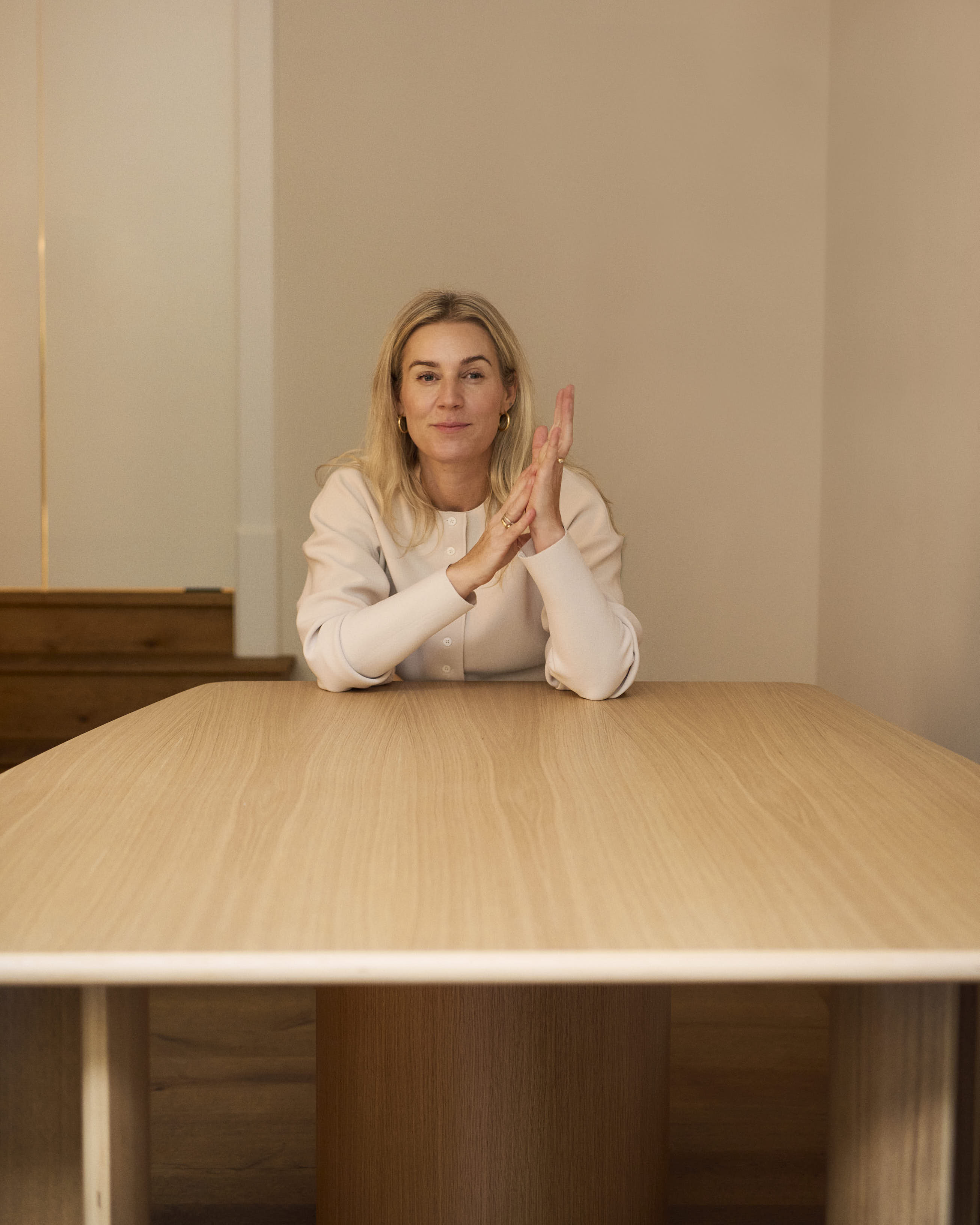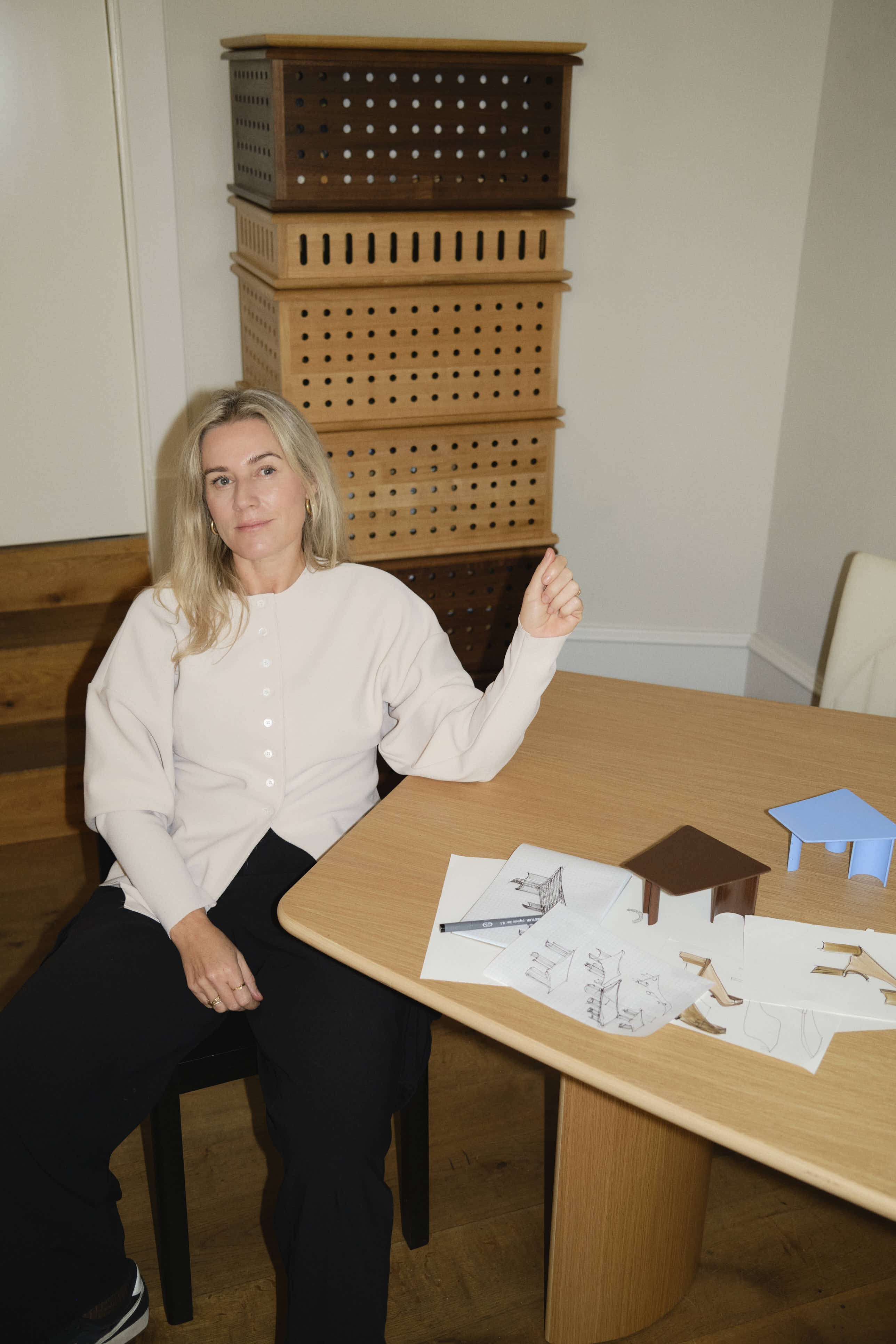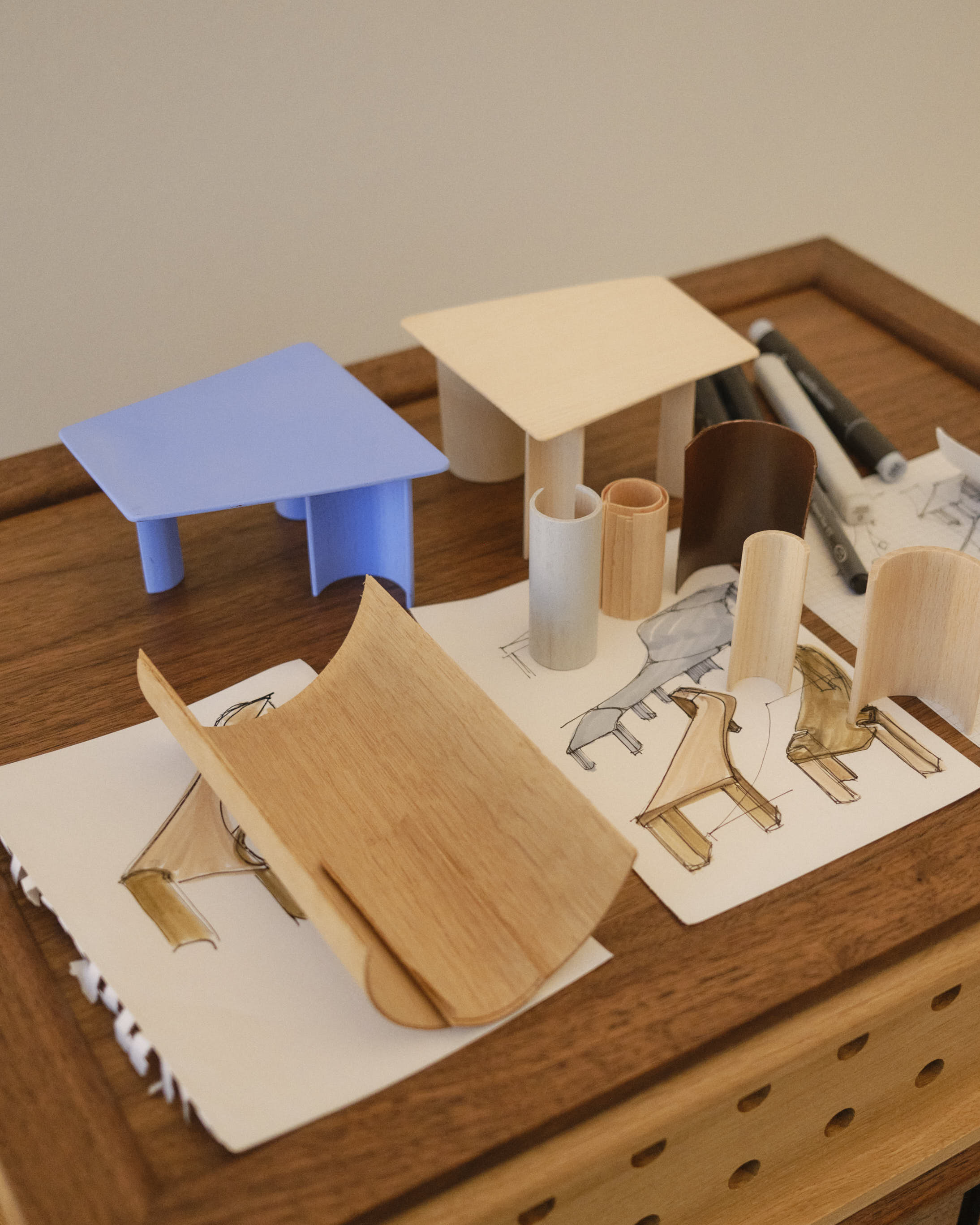 We visited Maria Bruun in her studio in Østerbro, Copenhagen, a bright, open space where large windows draw in daylight and illuminate prototypes, material samples, and working sketches. At the center stands Re-Norm in oak. Its sides are slightly uneven, and as you move around it, the geometry shifts. From above, the form resolves into a sail-like silhouette.