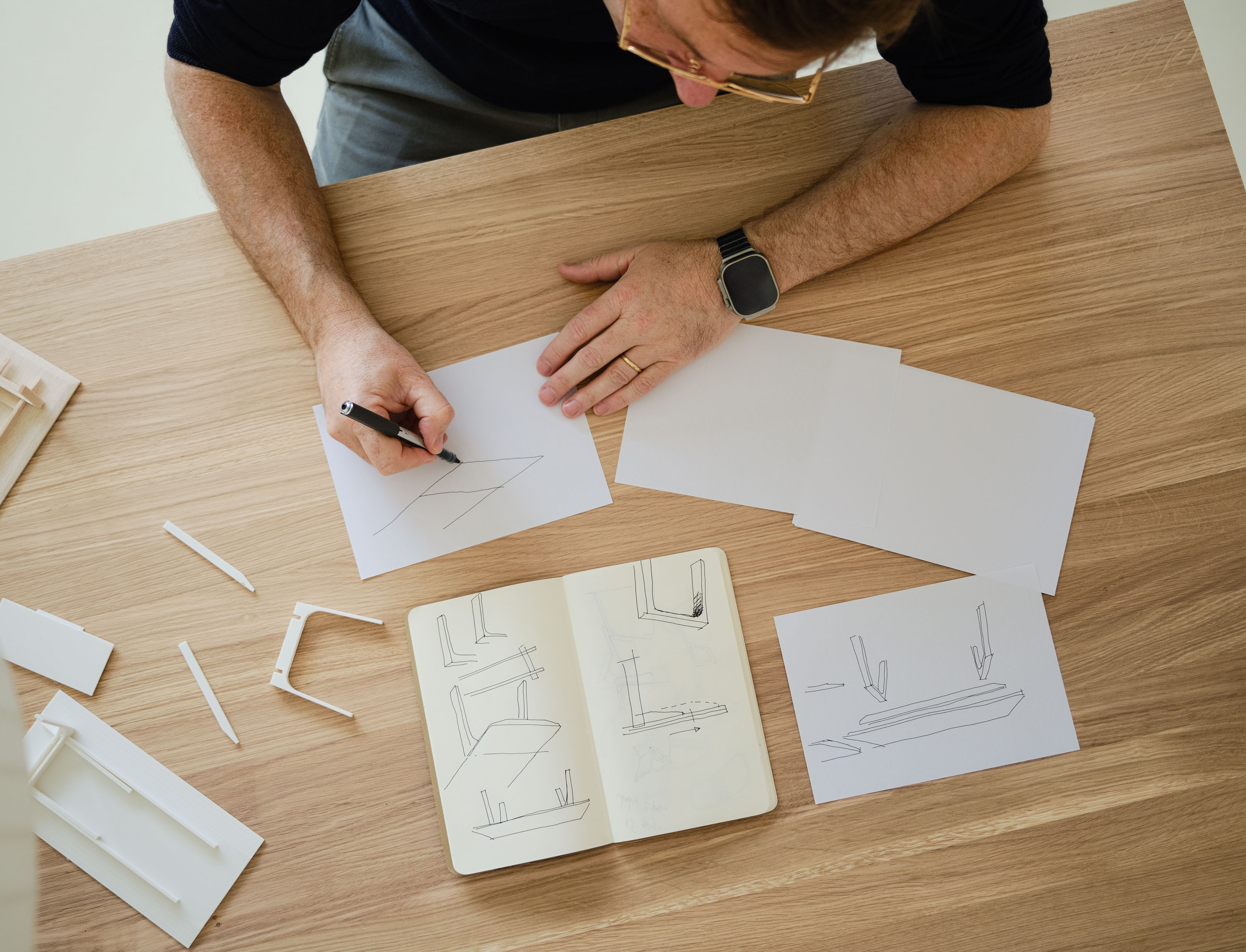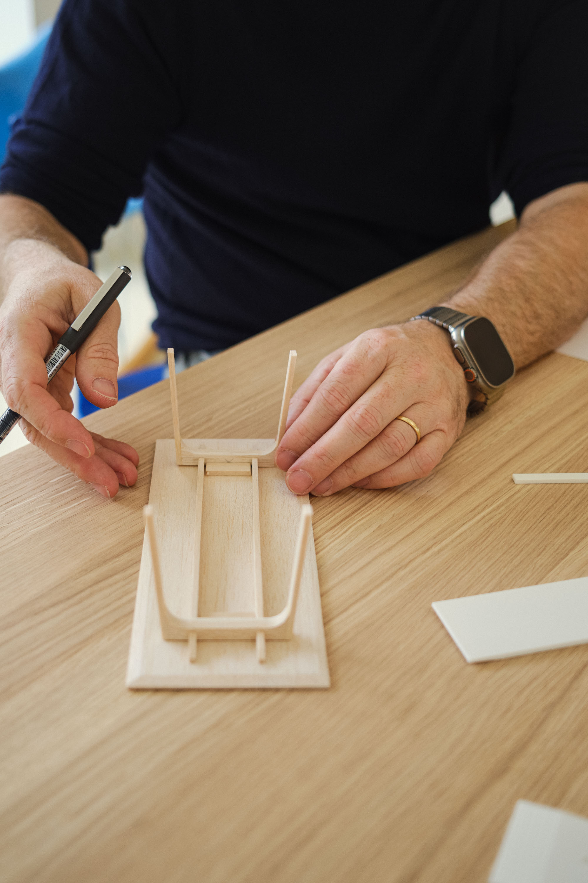 The table's development was a hands-on process, starting with scale models and evolving through physical prototypes. "Seeing something physically in your space is key, at least to my process. You get to appreciate its presence and functionality. You notice things," John notes. This tactile approach allowed him to refine the table's extension mechanism, which uses flexible wooden aprons to hold the leaves in place. It is a rare contemporary extendable table fully constructed in solid wood.