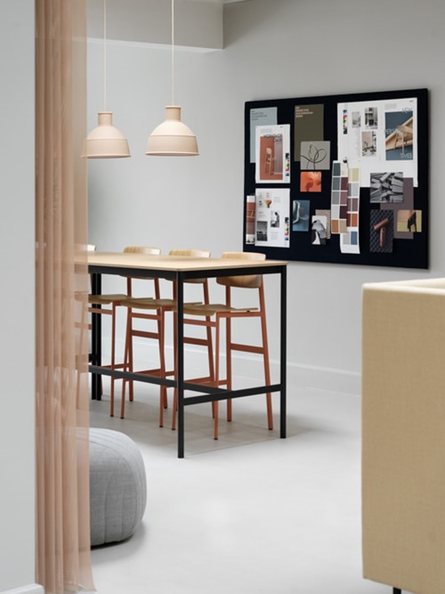 Speaking on the redesign, Muuto CEO Anders Cleemann says: “We wanted to create something that would serve as a functional workplace to the utmost degree for our employees while communicating the values and ideas of the Muuto universe throughout every single square meter, allowing us to welcome retailers, architects, dealers and press into our world,” and adds: “We wanted to explore the blurring of lines between workplace and showroom with the hospitality atmosphere, emphasizing how our designs across furniture, lighting and accessories are suitable for any workplace context, whether it be canteen areas, stationary desk spaces, conference rooms or flexible work zones.”