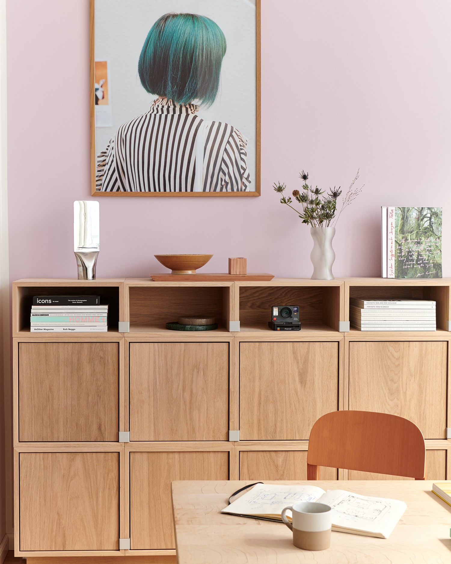 Marie is considering adding another row of open storage to house a growing collection of books. The open modules of Stacked are used to exhibit objects and curiosities that are often in use or that evoke fond memories. Magazines for inspiration, a vase or ceramic bowl from a trip abroad, a speaker or an interior scent.