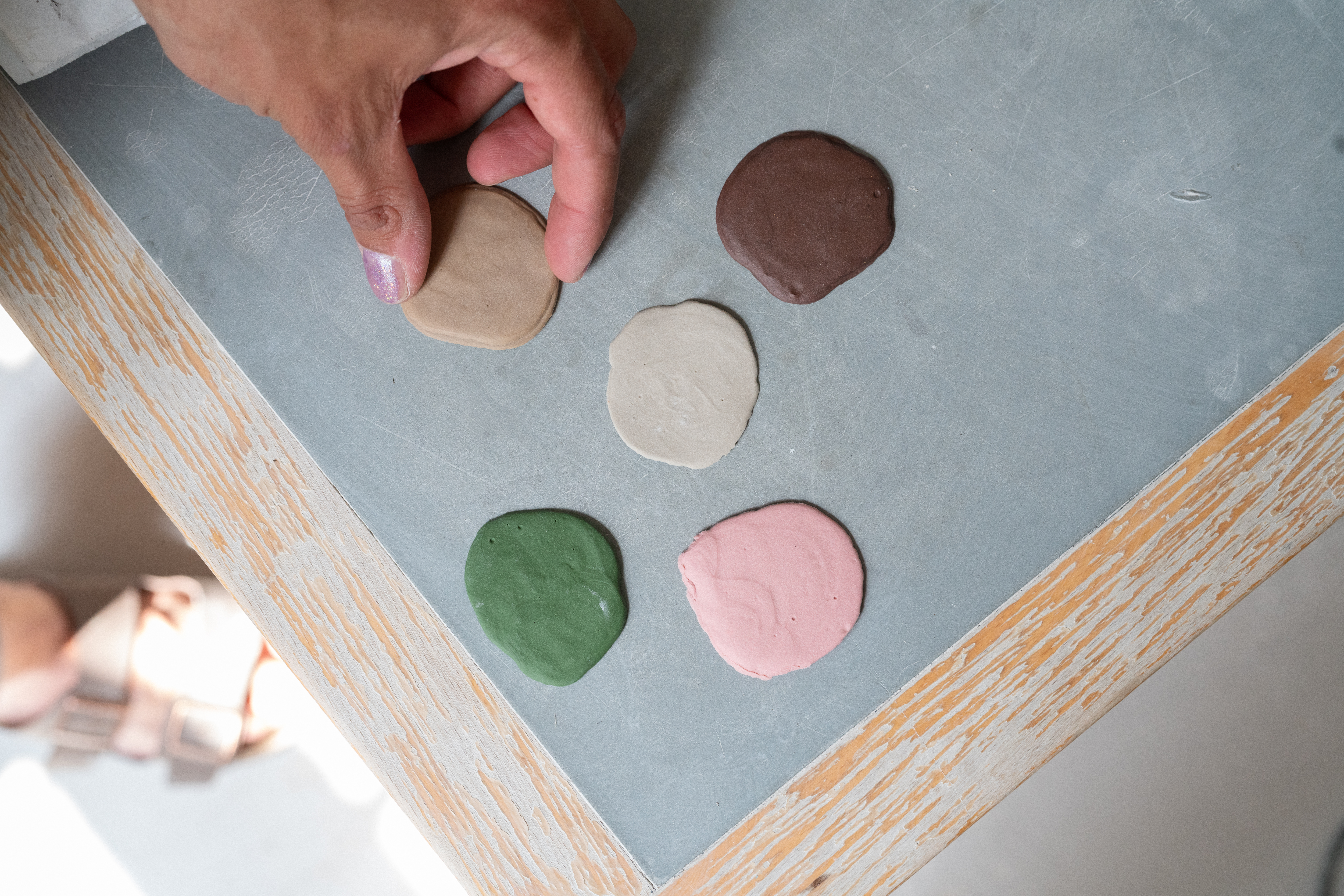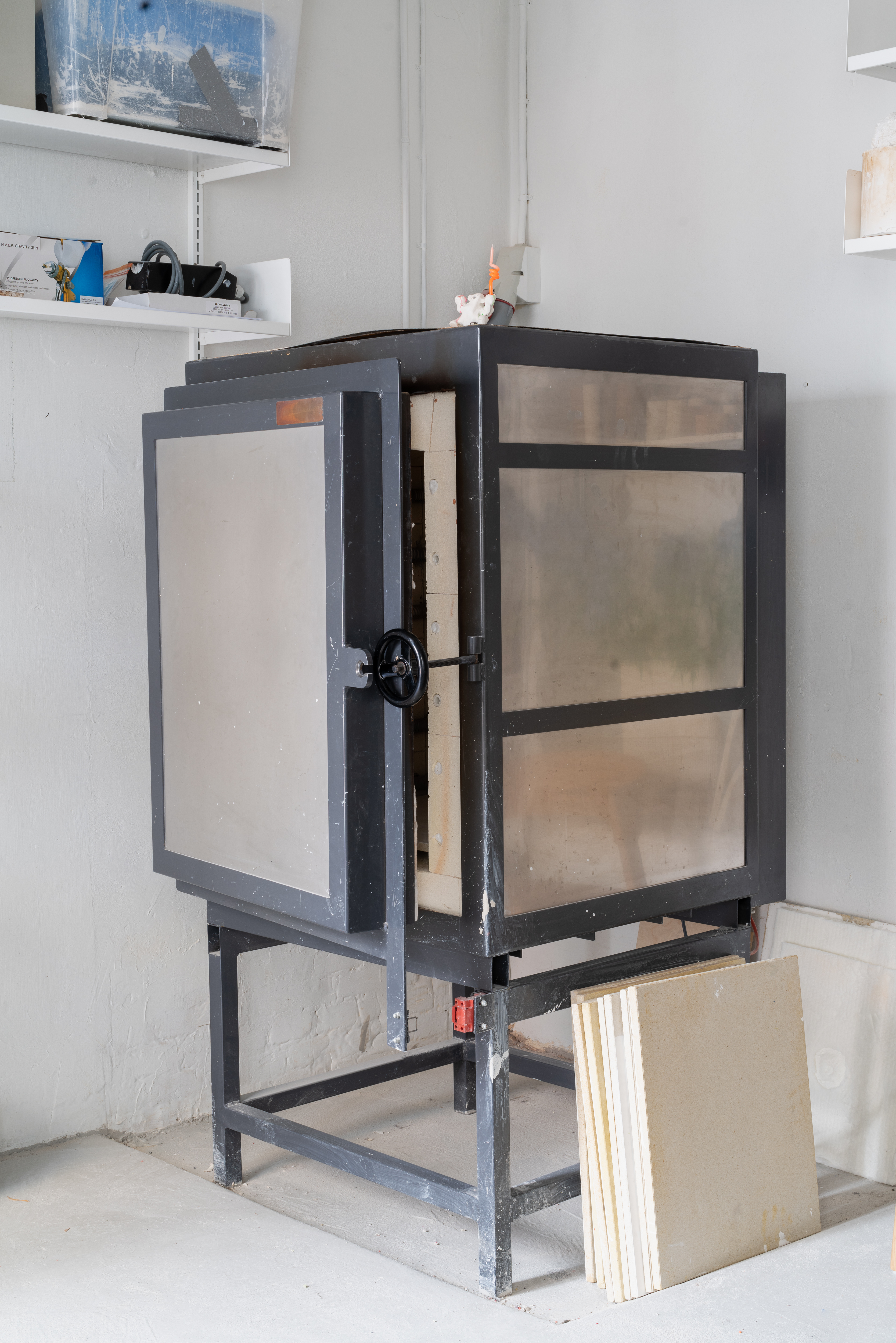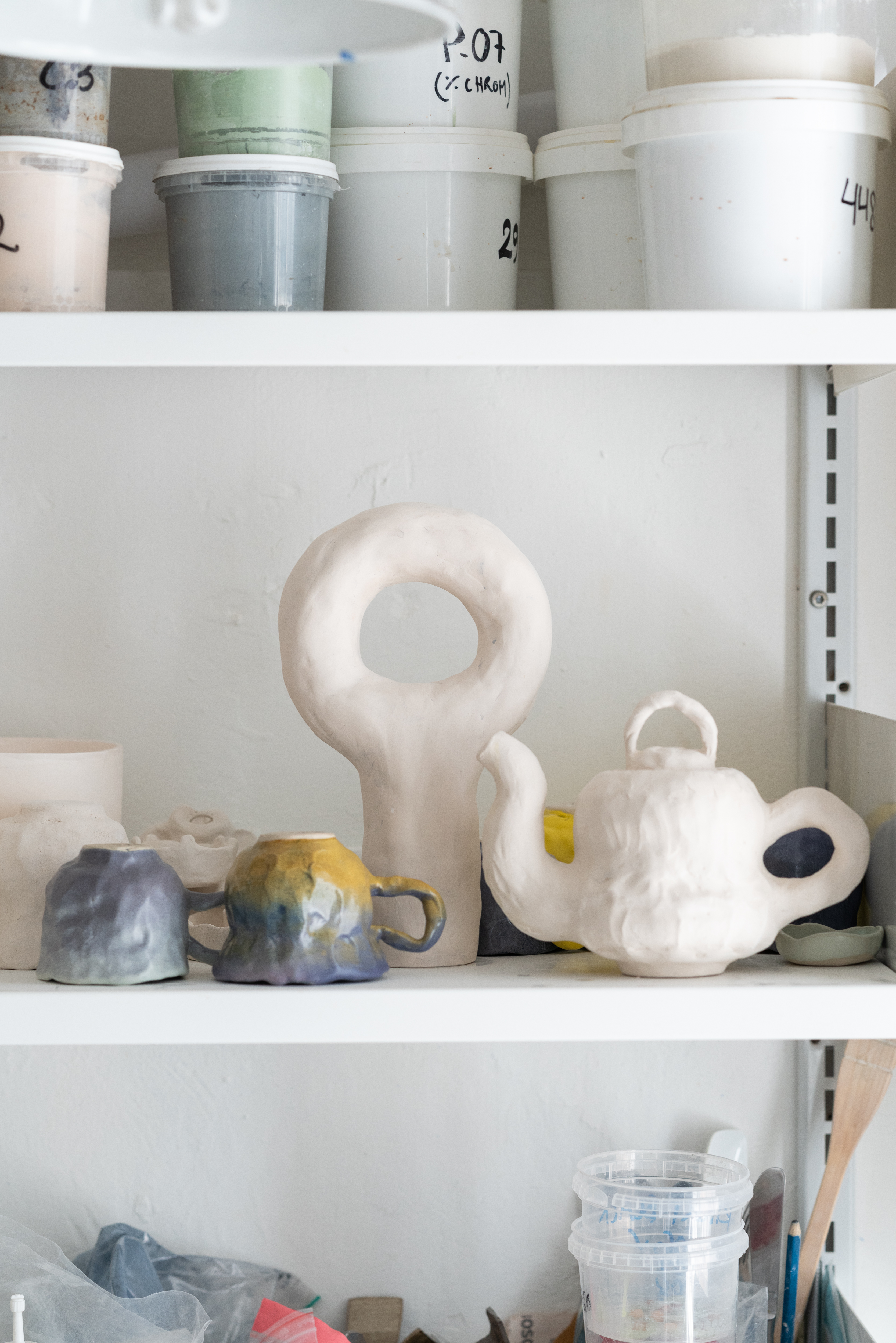 Scattered throughout Kaldahl’s studio are the minute physical elements that permeate his work, be they broken-off tiles, ceramic molds or left-over materials.