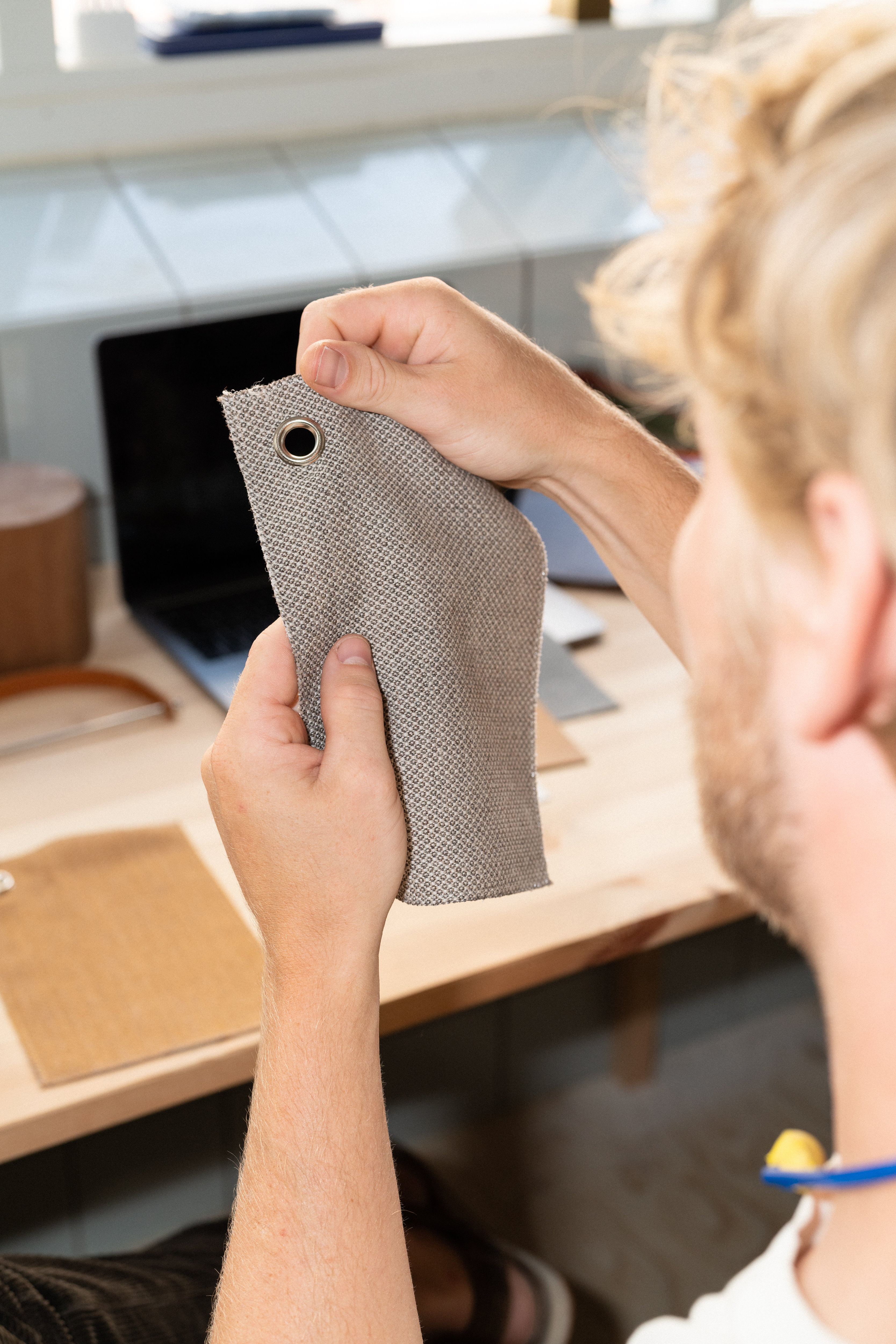 The duo moves towards their work desk upon which textile swatches and sketches used in the process for the exhibition design for Ukurant Perspectives 2021 are scattered. On their thoughts behind the design, Gustav says: “We knew from the get-go that we wanted the design to be an experience that strayed far away from the often polished exhibition formats that are shown at 3daysofdesign,” to which Frederik continues: “For Ukurant Perspectives 2021, the idea is really to get a sense of theatrical scenery. We’ll be using tangled backdrops and exposed stage equipment to create this feeling of a lively exhibition that represents the creative process and the endless paths and possibilities that come with it.”